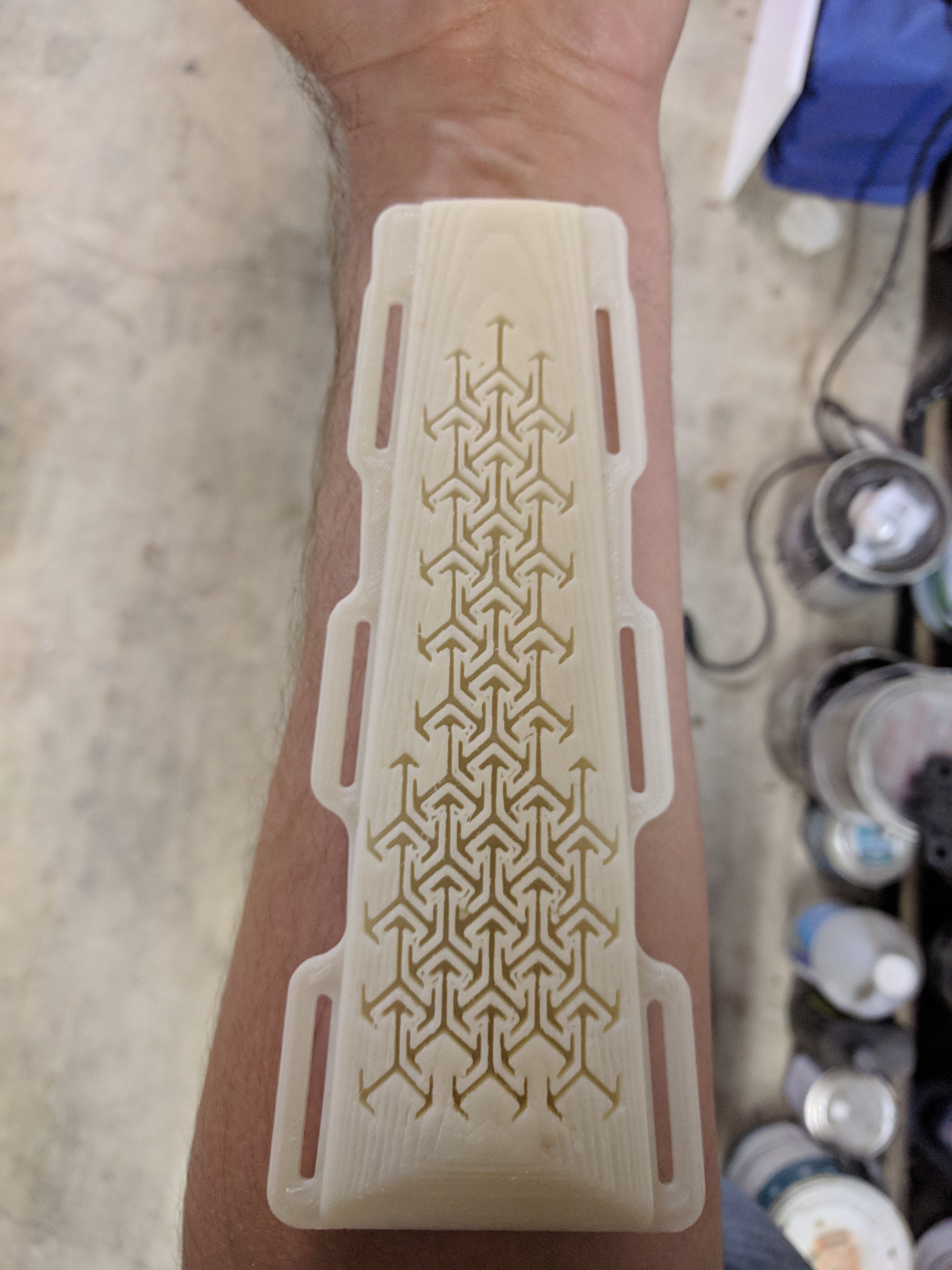 Haven’t posted any prints in a while. Hoping this will work for an archery arm guard. Supplementing one hobby with another. Now onto some sanding (perhaps an acetone vapor bath), painting, and sewing. If this turns out to be too abrasive, I’ll need to venture into flexible filament, though I doubt I’ll be able to get the detail. Thoughts?