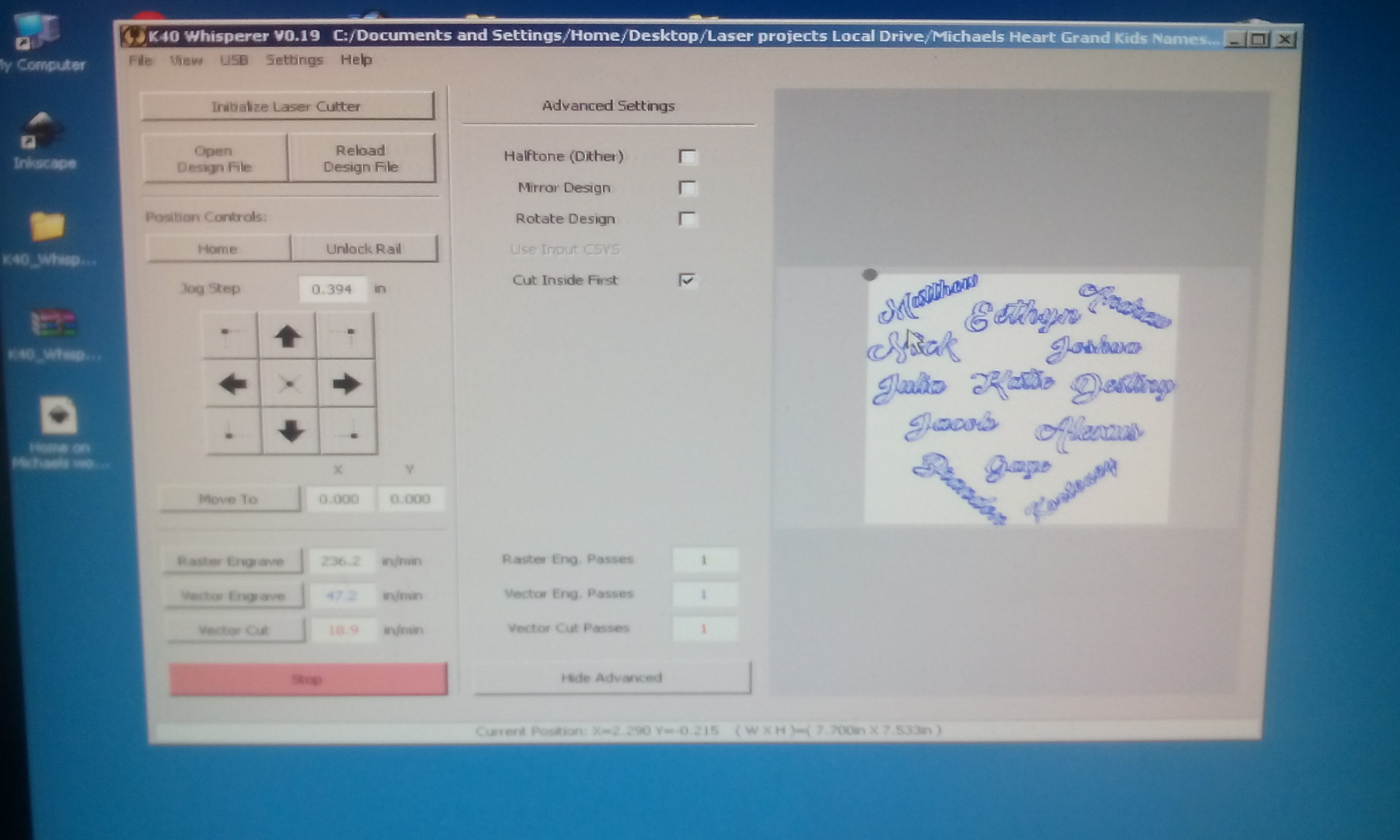 Guess I really don’t understand now the laser starts the vector cut. Images are of the design down in CDx4. The heart outline is the actual size of the heart as I traced and scanned it. Then the second image is as it first appears in Whisperer. 3rd image is after I have moved the laser head by dragging the image around on the right side of Whisperer 4th image is the laser head on the heart ready to engrave. 5th is the outcome and can see middle right side to bottom is off the edge.