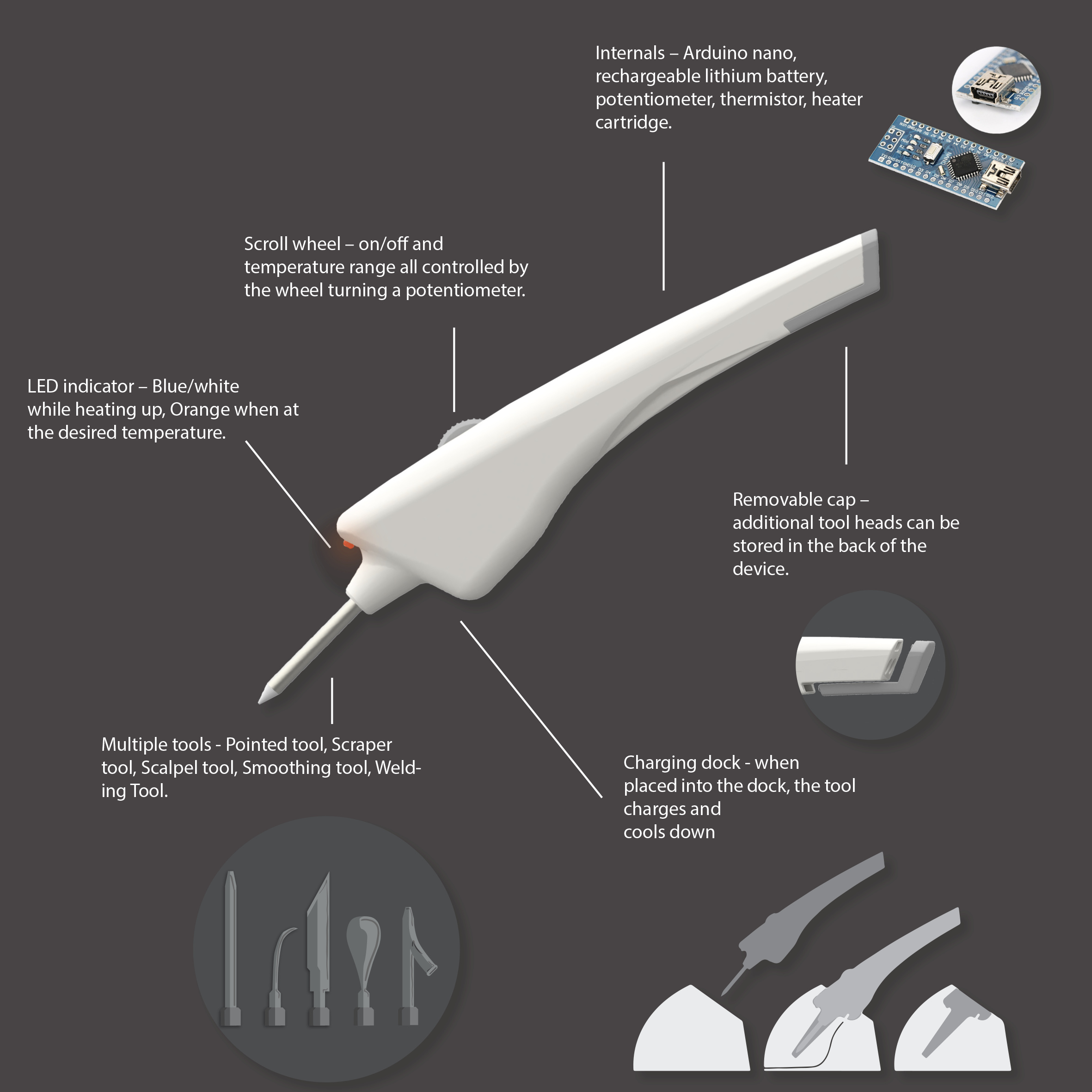 for the interchangeable tips (as seen in the pic) i’m thinking: Pointed tool, Scraper tool, Scalpel tool, Smoothing tool, Welding Tool.