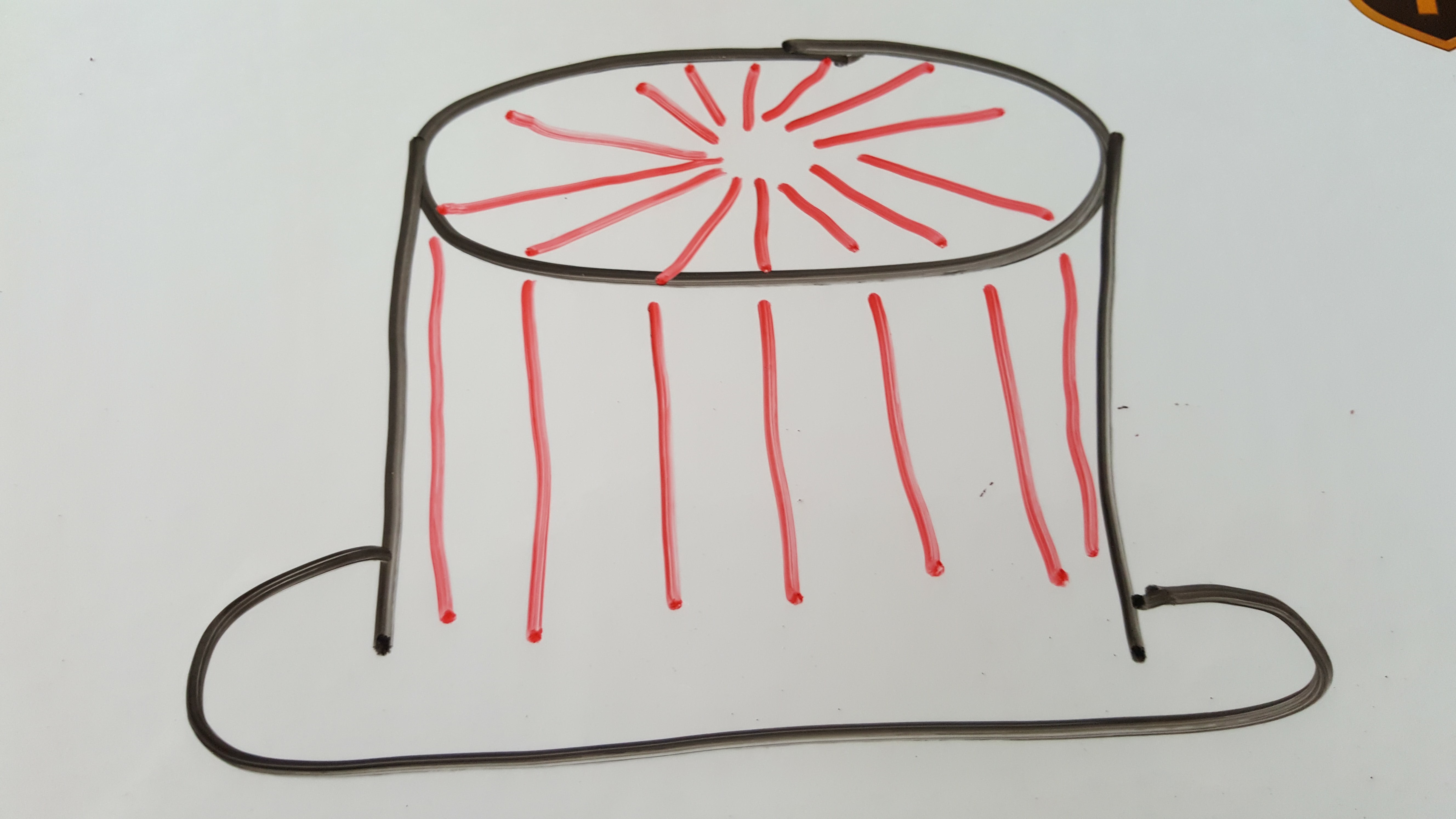 @marmil You’re visualizing correctly. The strips would start at the center of the top of the hat, run outwards to the edge, bend over the edge (will have to cut and wire connect them) and then run down the sides of the hat towards the brim. Here’s my elementary drawing - the red being the LED Strips. I’ve only seen hats done in the horizontal fashion, so of course I wanted to be different. But, there might be a very good reason they’re horizontal…