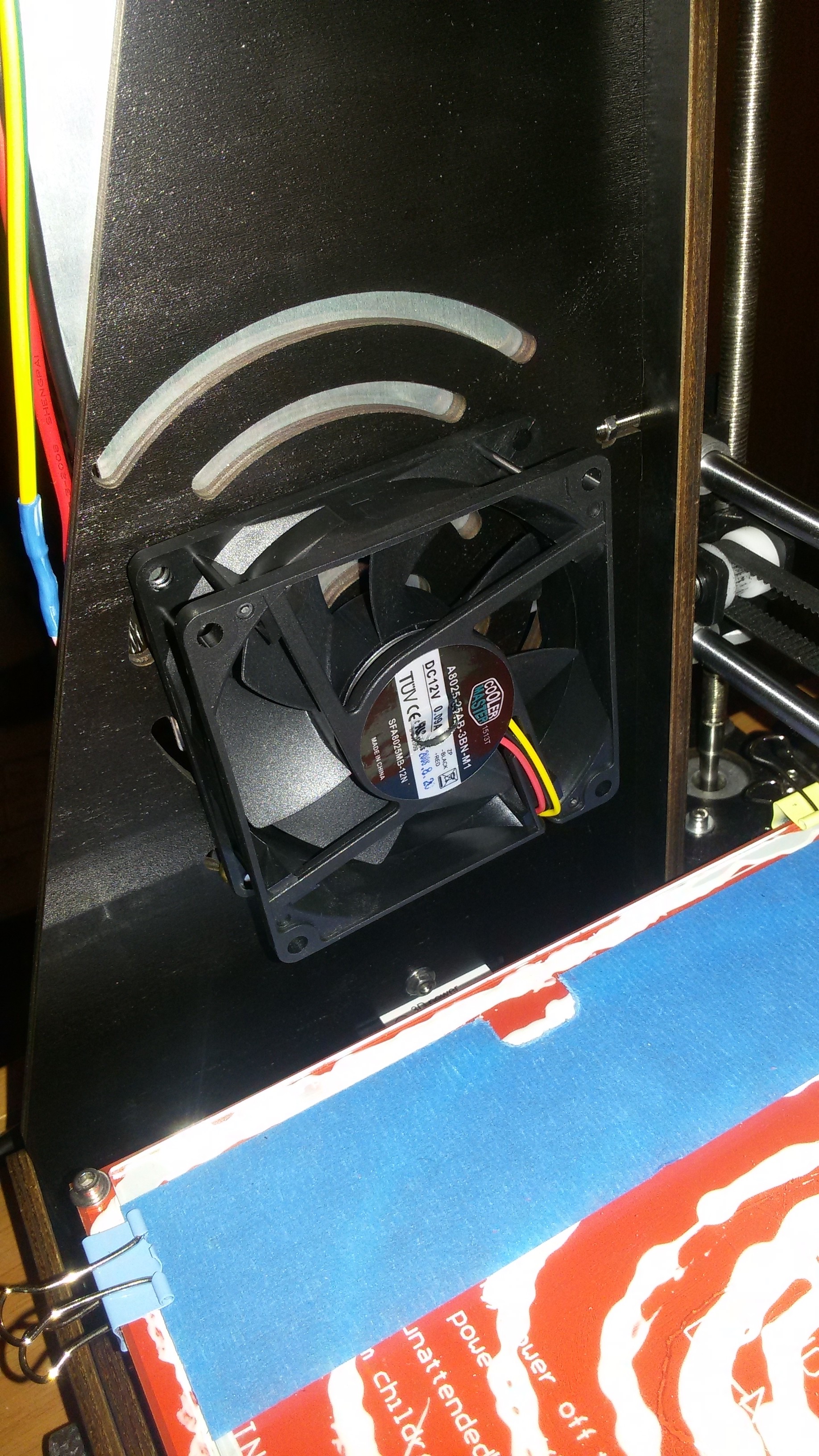 Here is my 80x80 bed fan that I attached to the output of the second extruder.