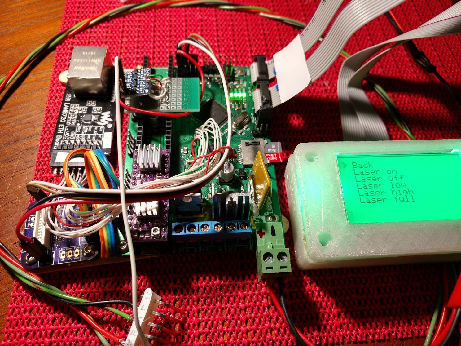 Hello everyone, After getting back from a bracing walk in Whitby this afternoon I set about getting an old raspberry-pi with a camera to run the the VisiCam software. I’m going to install it together with VisiCut and Smoothie-ware shortly. The targets are markers used to referance the position of the bed to the position of the object to cut, in this example you can see a little tin lid with a circle overlaid on it. Below is a photo of my new controller, almost configured ready to swap over for some testing. You can see a modification which is a level shifter for the pwm laser signal which are fed from some of the outputs of an unused stepper driver. David.
