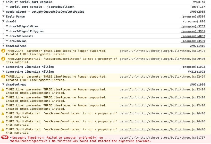 Although ChiliPeppr’s dependency system is super awesome and uses require.js, the one downside to the widget approach is that if multiple widgets need a library, they define a url to it. If those url’s get updated in one widget, the other widget may load first randomly, and you’ll get the old library randomly. The key to solving it is to make sure all widgets refer to the same url. The widgets in the Grbl workspace that refer to Three.js include the 3d viewer, which is updated correctly, the auto-level which is Grbl only, and Eagle which is updated. So the error probably occurs because of auto-level referring to the wrong version of Three.js.