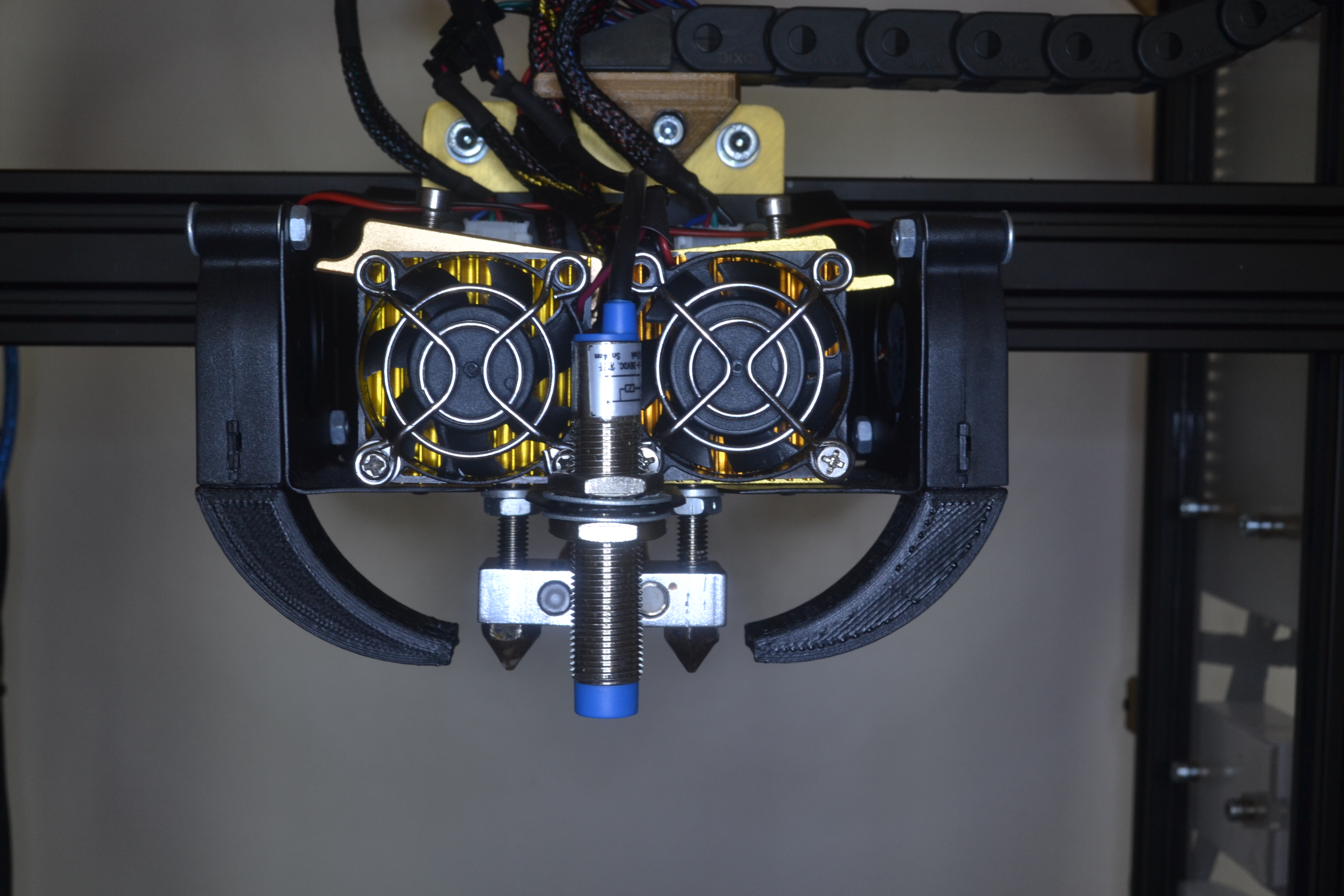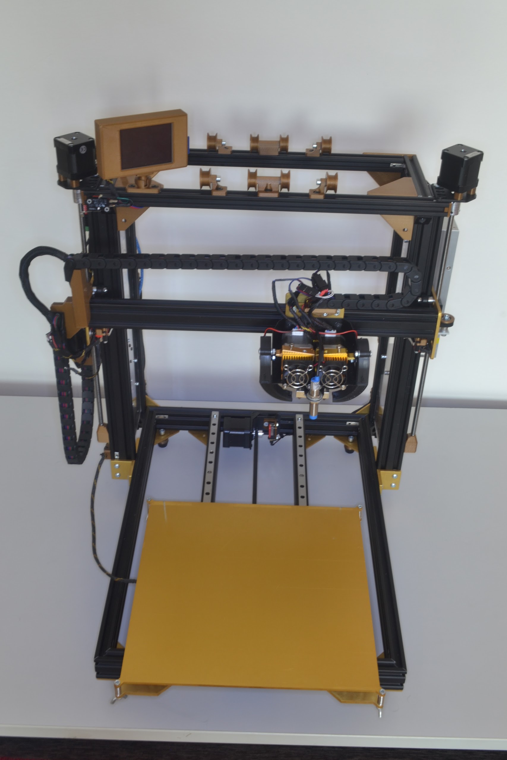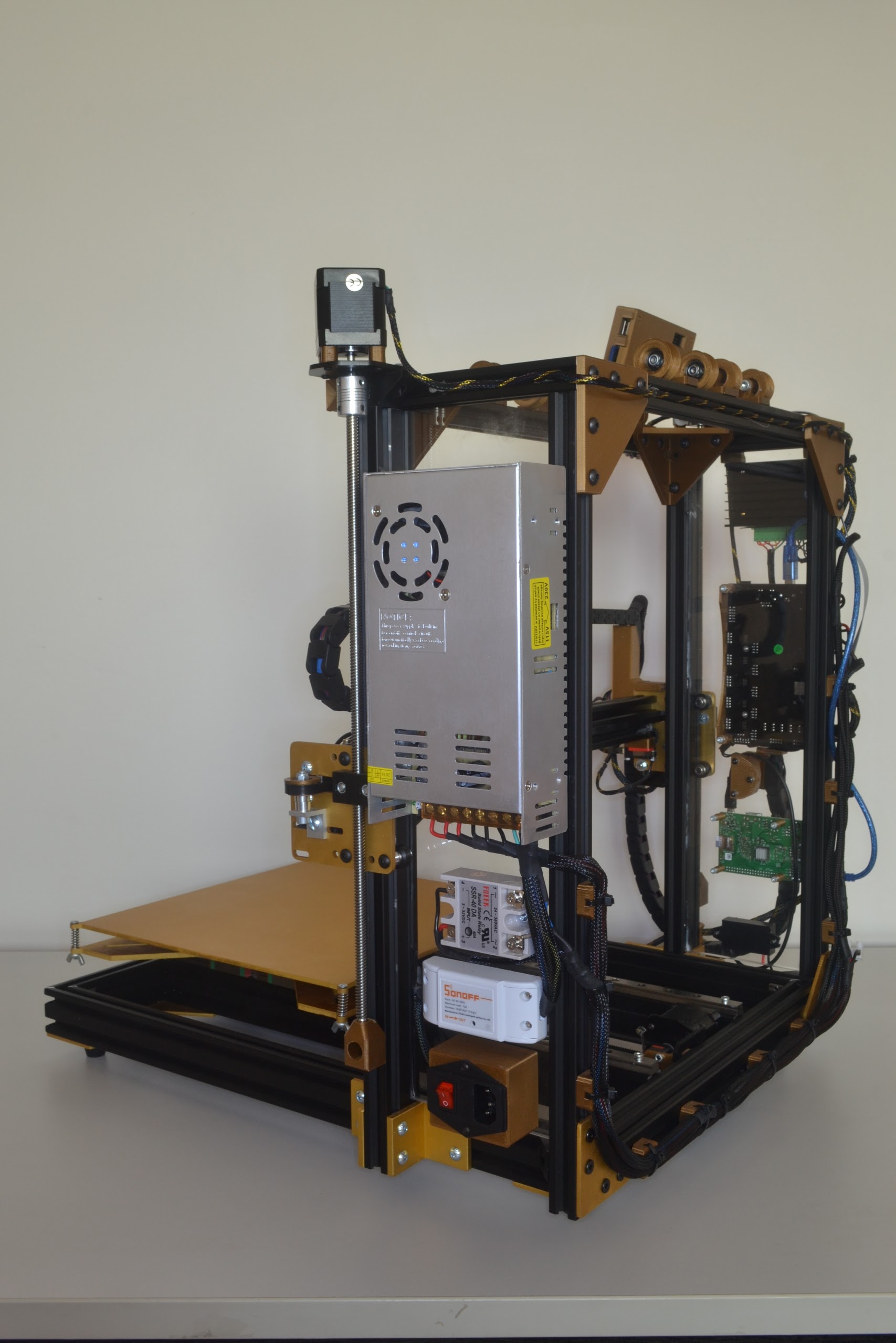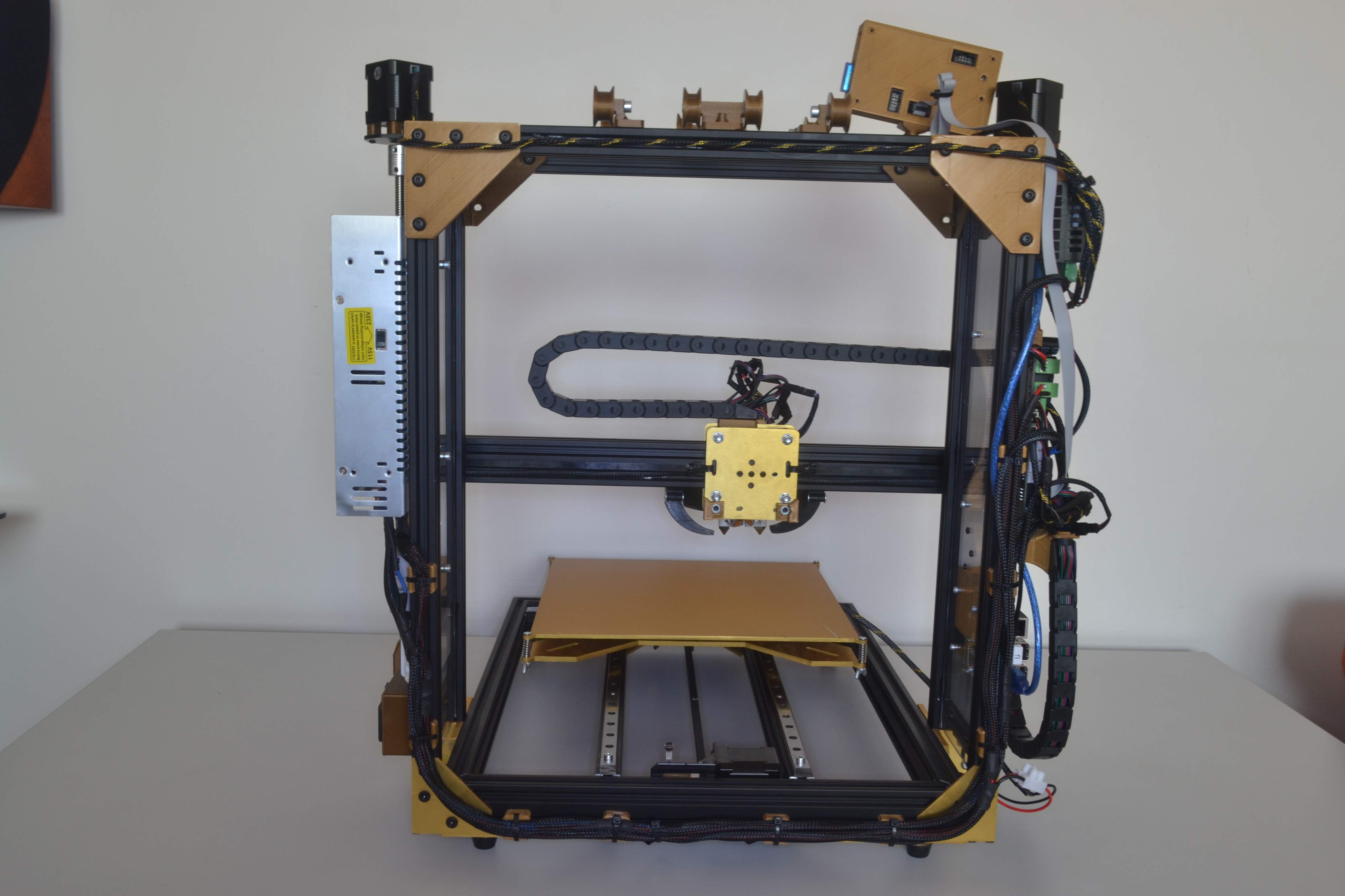 I build custom printer from alu v-slots and custom cutted alu plates. Build space is 300x300x300 mm, I will use dual extruder configuration. Bed is heated and control ensures mks sbase 1.2. I used tens of meters of wires, most of them sleeved, more like 100 custom printed parts, nearly 40 electrical components and it holds together around 450 screws and nuts.