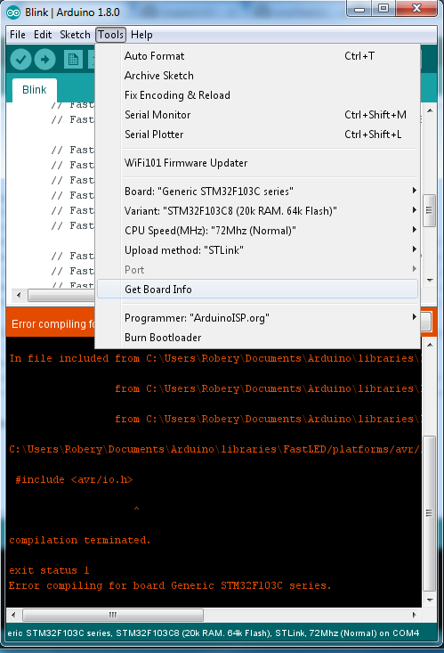 Hello, please help me, can it FastLed library support board STM32F103C8T6 ARM STM32, I use software arduino but always appears error like this :