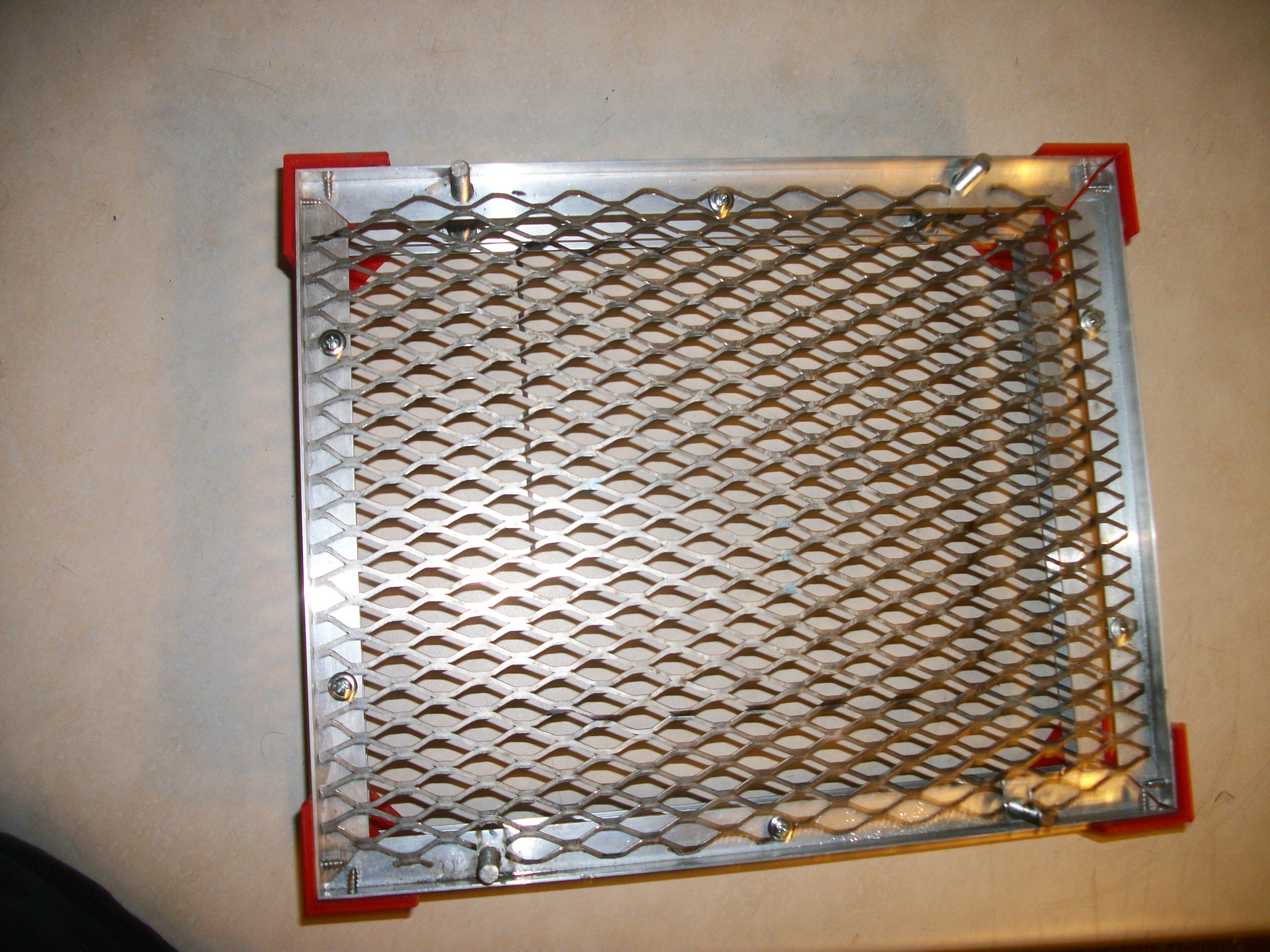It’s a package of disposable grill grates. They’re somewhat dished, but could easily e cut down to a 14 x 14 flat section, and a lot cheaper/more available than standard expanded metal, which is insanely expensive in small sections, and much heavier than we need for this application.