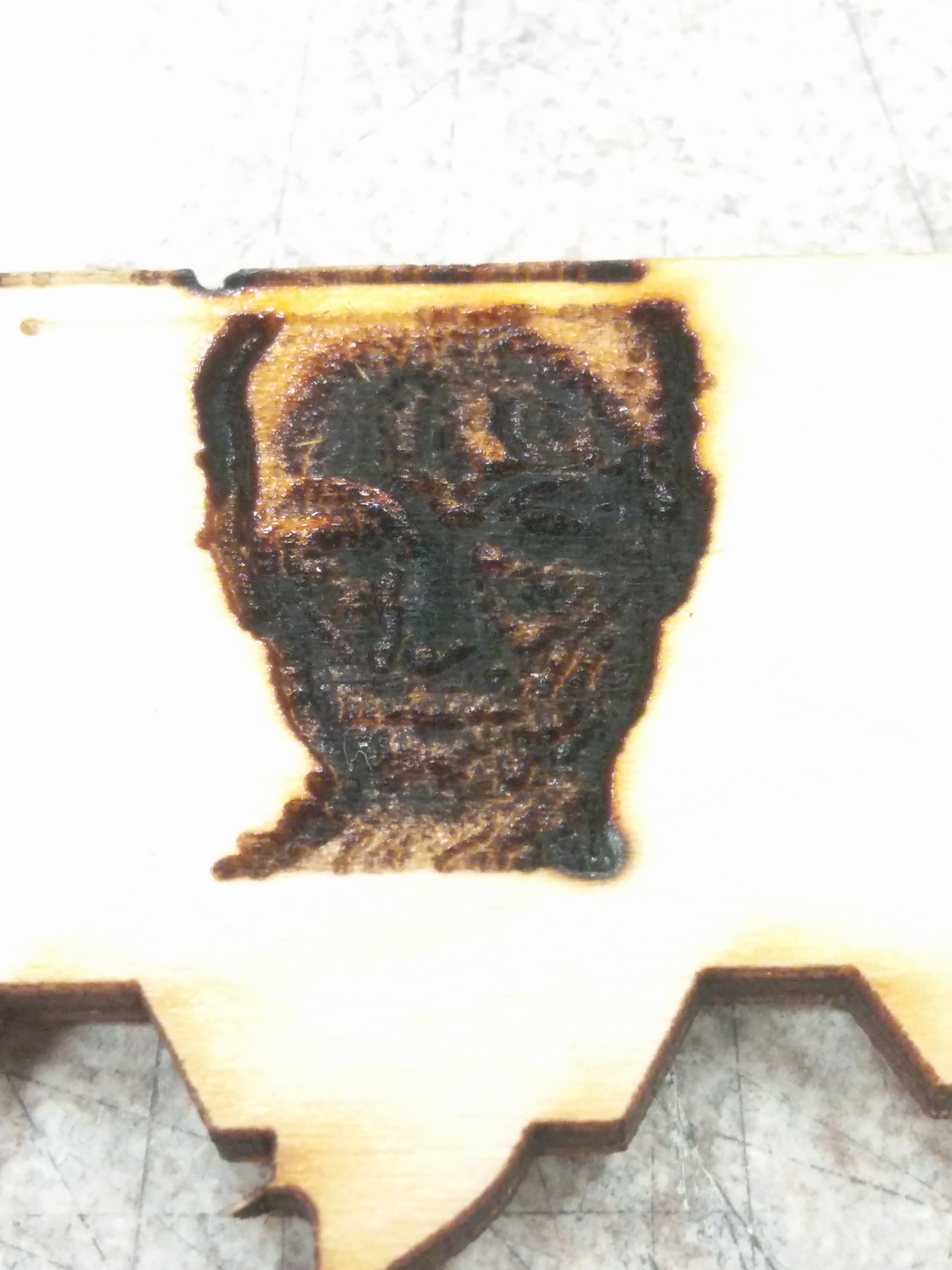 Even though it looks messed up, I can make out the nose, eyes, mouth in the image. So it’s at least vaguely getting there. I think there are too many pixels (or dots burned) too close to each other. If you scaled the image up to a much larger size (& test on something super cheap) you might end up with a much nicer result, maybe?