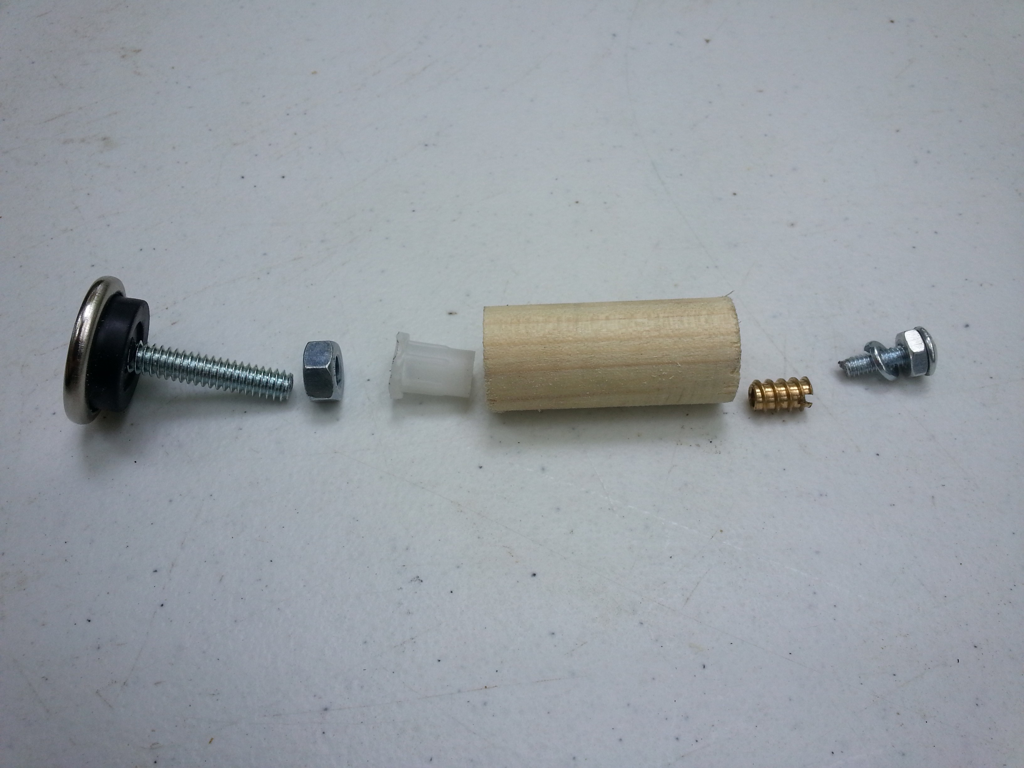 Here is a quick and simple set up for a z-axis adjustable bed. This is something I just came up with to start with as I learn about the machine and will probably do something better later on. Materials: (4) adjustable furniture glides, (4) 1/4" hex nuts, 3/4" dia wooden dowel rod, (4) #8-32 brass wood insert lock nuts, (4) #8-32 x 1/2" machine screws and associated washers and lock washers.