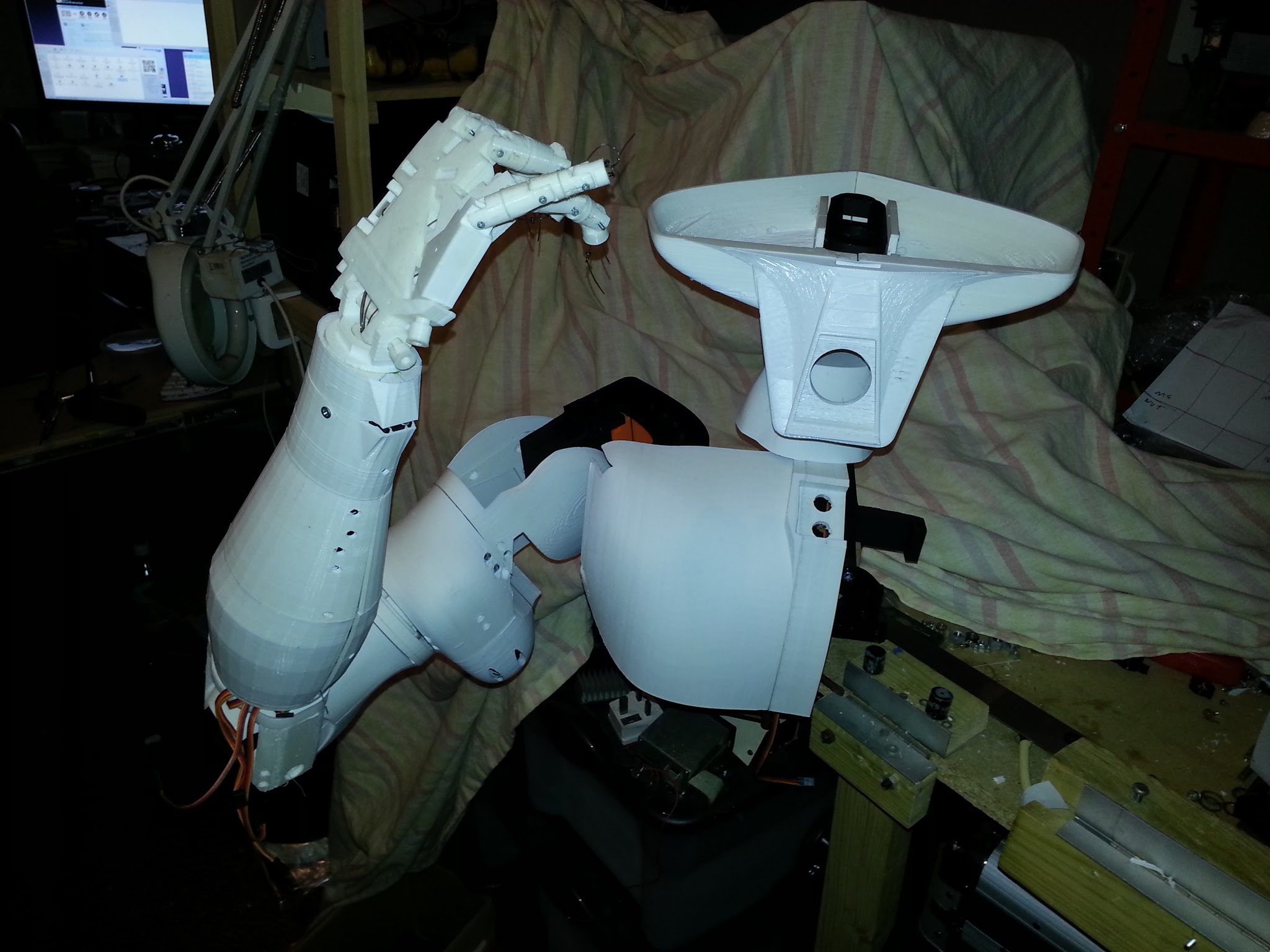 Here is the nearly complete 3d printed humanoid robot. This is designed to be 1:1 scale with me (6’1) but extrapolation shows it may be larger.