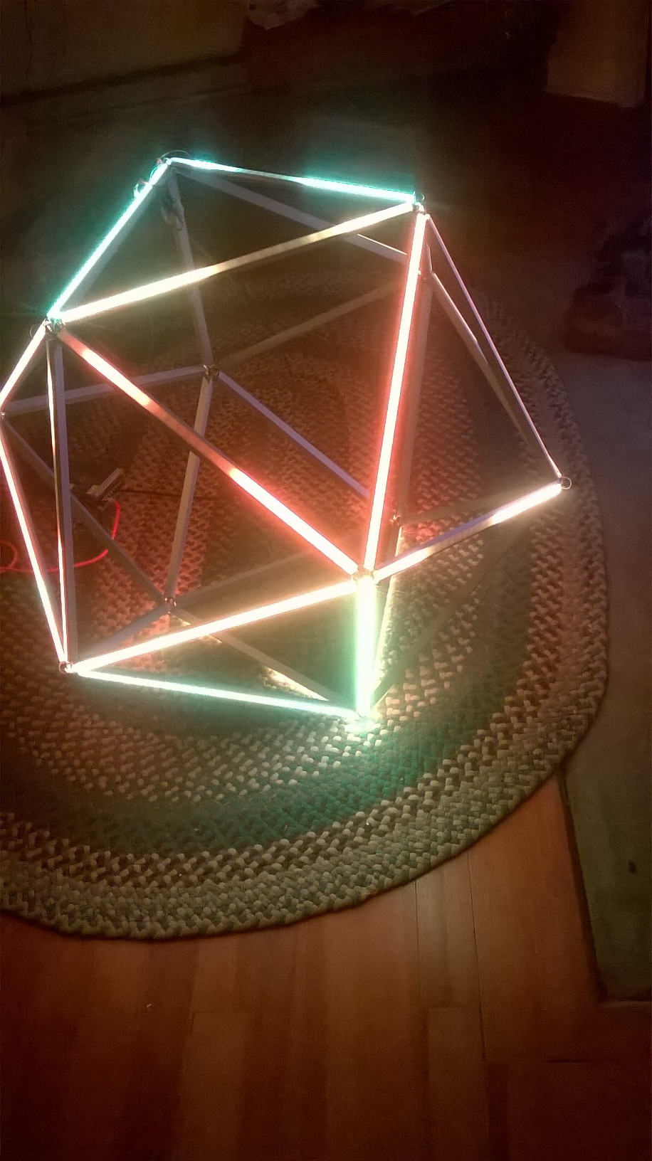 The more I think about this, the more I like the idea of having a canvas array of say 32x16 and mapping each icosaLED to one (or more, via supersampling) canvasLED. You can always increase or decrease the resolution of the canvas independently of the physical resolution of the icosahedron, to balance speed and memory and visual density etc.