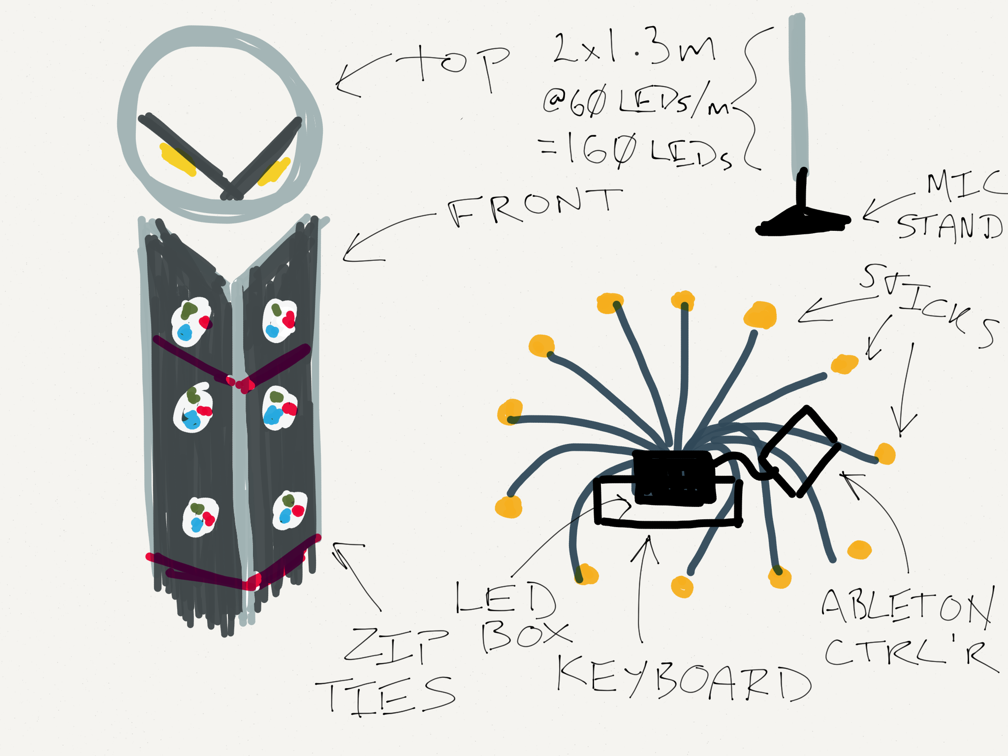 The setup consists of somewhere from 12 to 16 “sticks” mounted on mic stands, placed in a circle around the performer (whose setup is a keyboard and an Ableton controller plus a laptop.) They’ll be a bit lower around the front so you can see his face and a bit higher at the back so he’s kind of “encircled”.