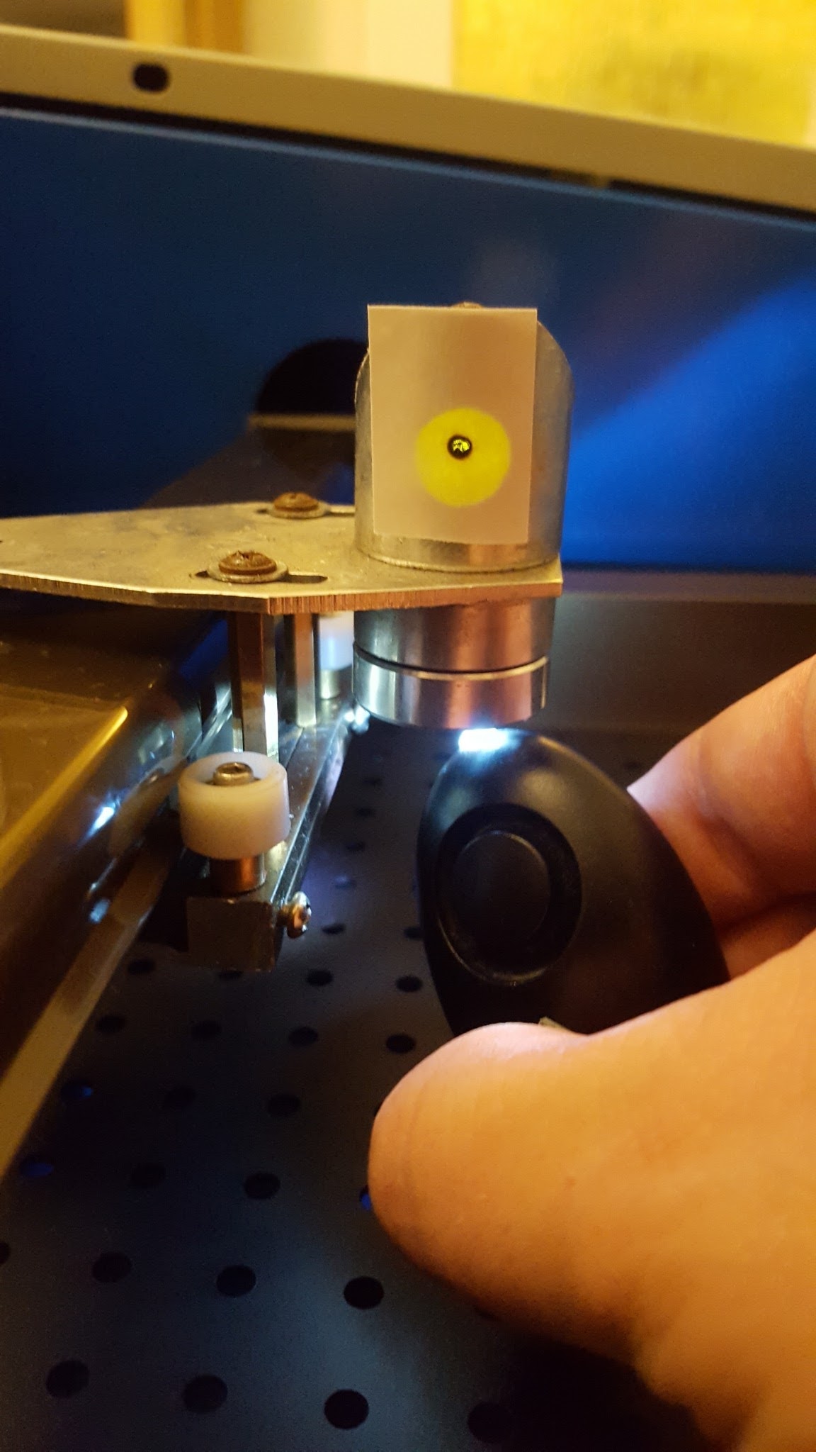 I have made sure that the rails are planer trough the whole section. I have adjusted the beam to shine directly into the middle of the third mirror. Works like a charm now and it goes directly trough the hole of the air assist cap. I even managed to burn myself with the beam… thankfully it was on the lowest setting…