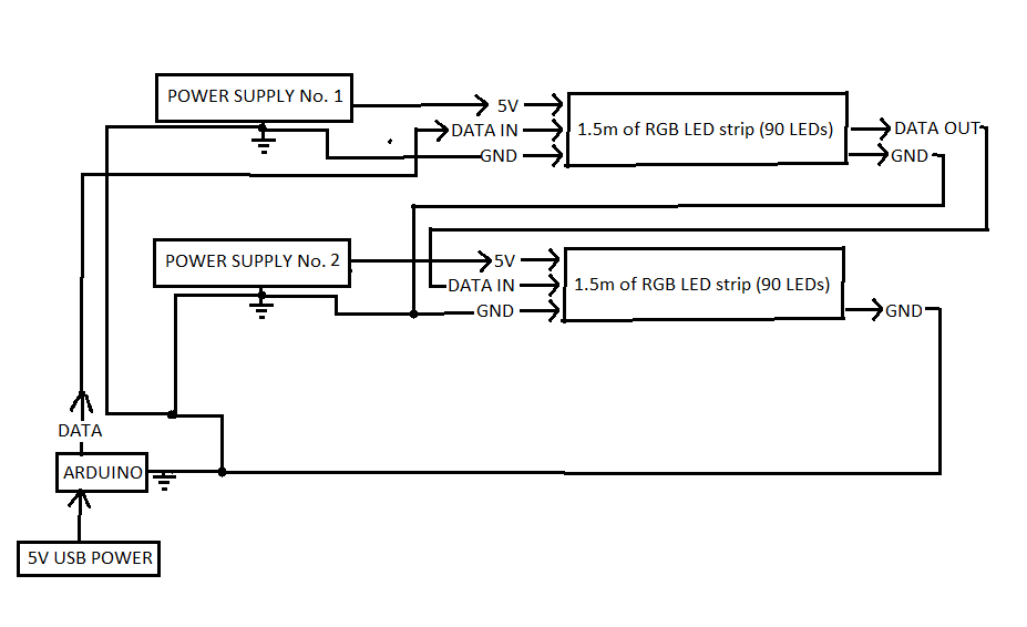 I am using 3m of WS2812B LED strips for aquarium lighting. I am using two, 10A, 5V power supplies (1 each to power 1.5m of LEDs). I have attached a schematic of what I am running.