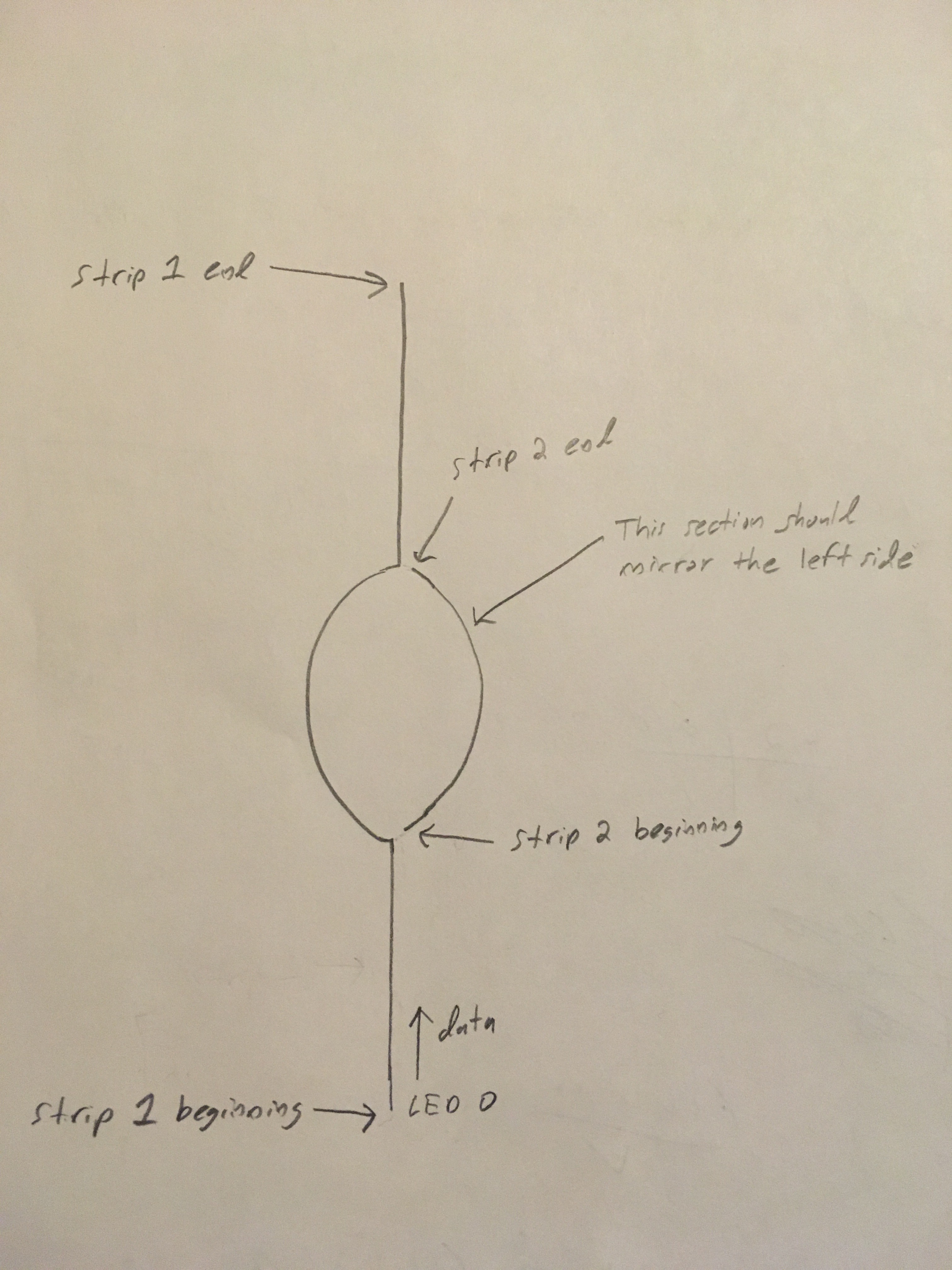 Question 3: Can anyone point me in the right direction on the best way to mirror part of a strip to another strip? Please see the attached diagram picture at the bottom. On the diagram, the left line will be a strip of 500 leds. I would like to have a separate line of about 150 leds on the right part of the circle that would display the same thing as the leds on the left part of the circle. Would the best way be to write a for loop with something like leds2[0+i] = leds1[200+i]? Or is there a FastLED library function that does this more efficiently?