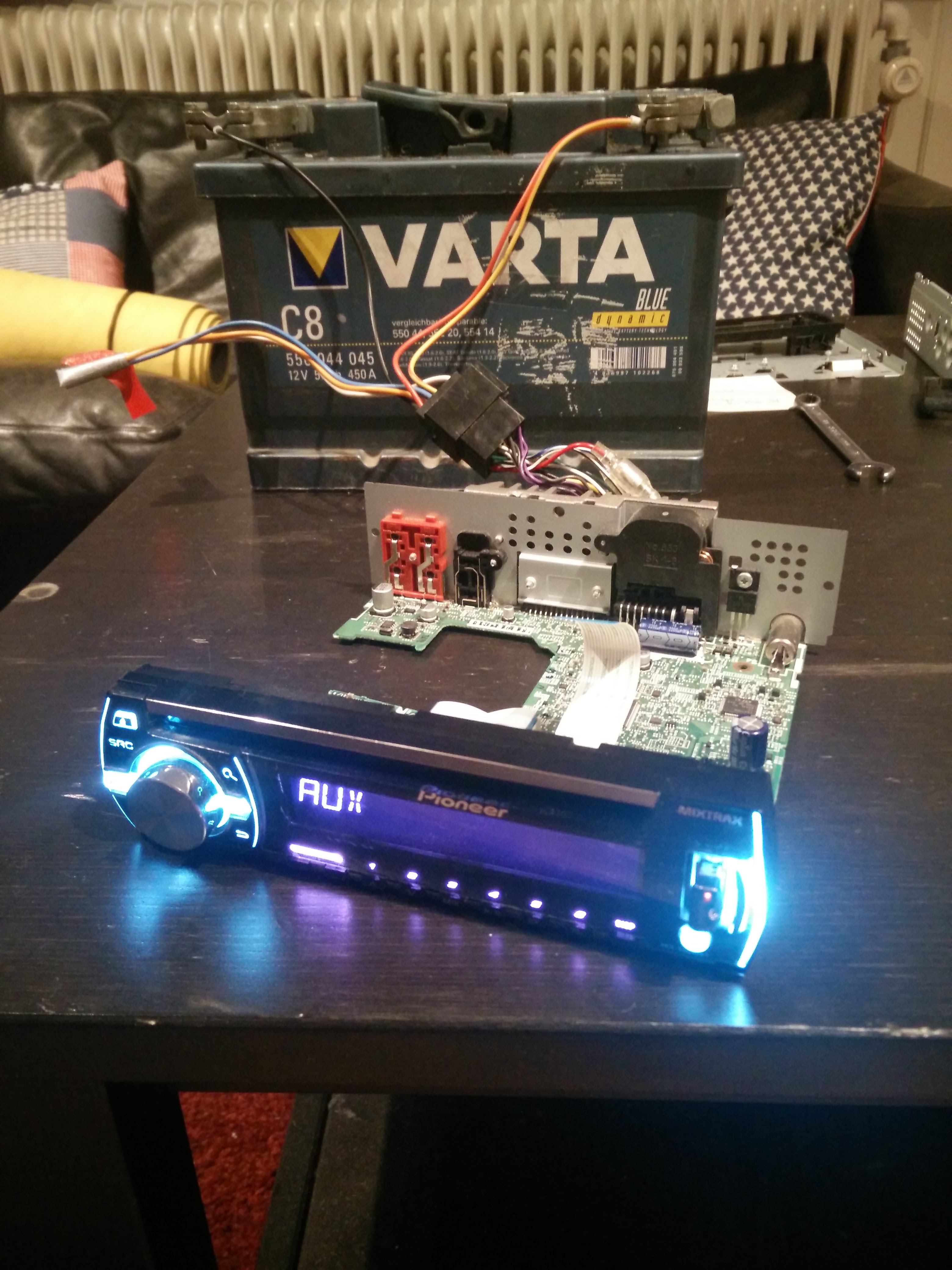 My car stereo is the model Pioneer DEH-X5500BT. I haven’t been able to find the schematics for that exact model but I found them for the DEH-X3500UI and so far when inspected I haven’t found any differences between my physical car stereo and the other one. Neither on outside looks nor in the document with the schematics (in the area referred to the RGB LED controlling). And the main MCUs being used are the same.