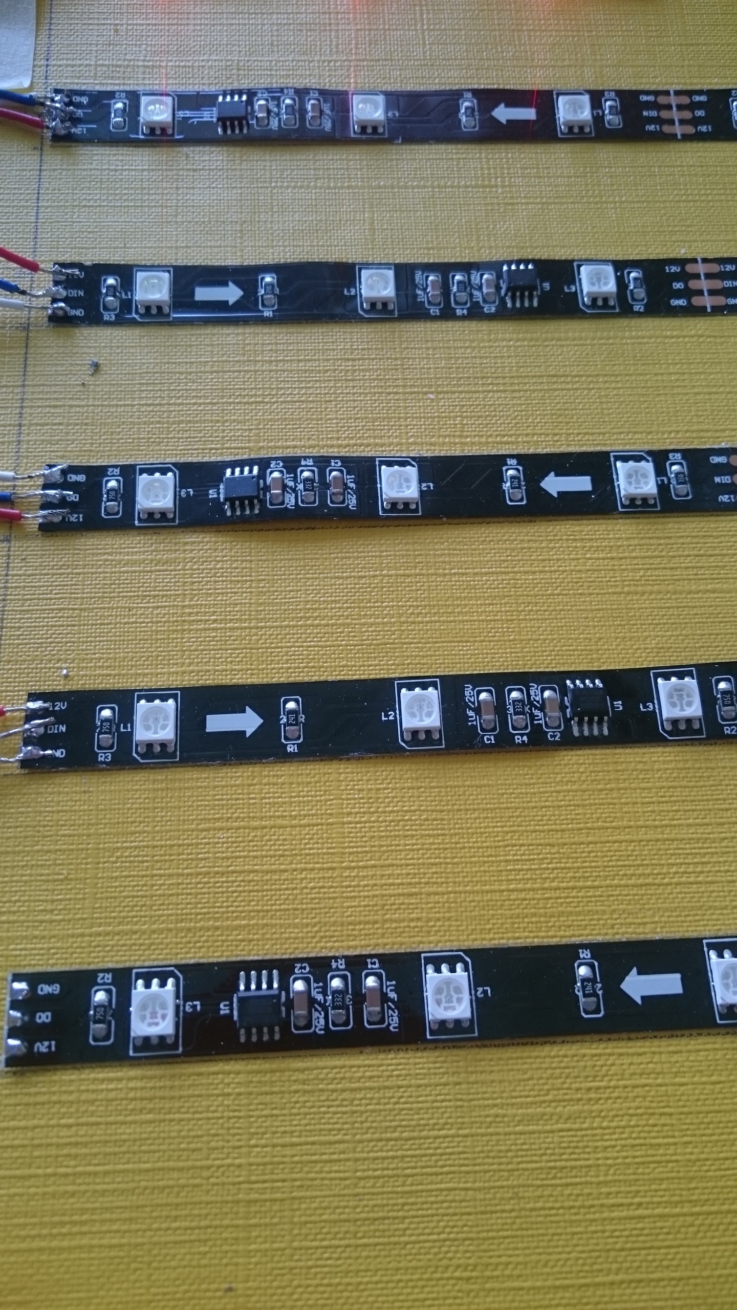 That really is an interesting strip, as it has 3 pins, but the WS2811 isn’t integrated with the 5050 type LED and it’s 12V at that. Also, your soldering is in serious need of improvement. I recommend boning up on your soldering skills and to use heat shrink tubing. In the meantime, I’d recommend getting a real strip of integrated 5V WS2812B’s or even APA102C’s.