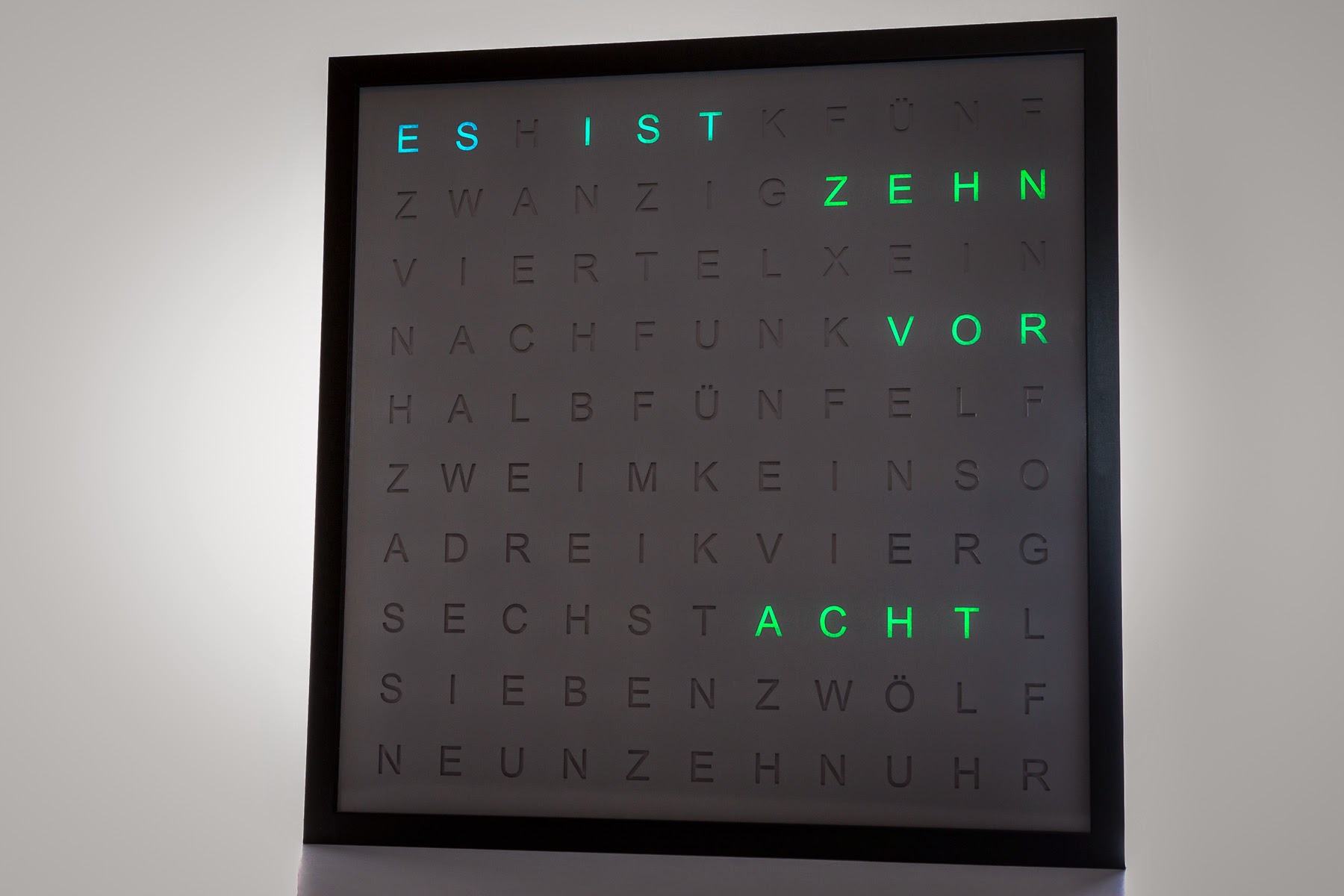 after reading for a while and playing around with FastLED I thought I’d share my recently finished project. It’s a word clock I built for my sisters birthday. So far everything’s running fine, now I need to spend some time on my other projects (with up to 128 LEDs so far).