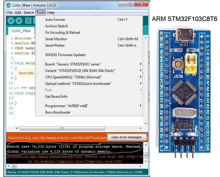 Why when I use FASTLED library (https://github.com/evq/FastLED/tree/stm32f103) in my skecth, program storage becomes very full when compiled. The program code is still very little.