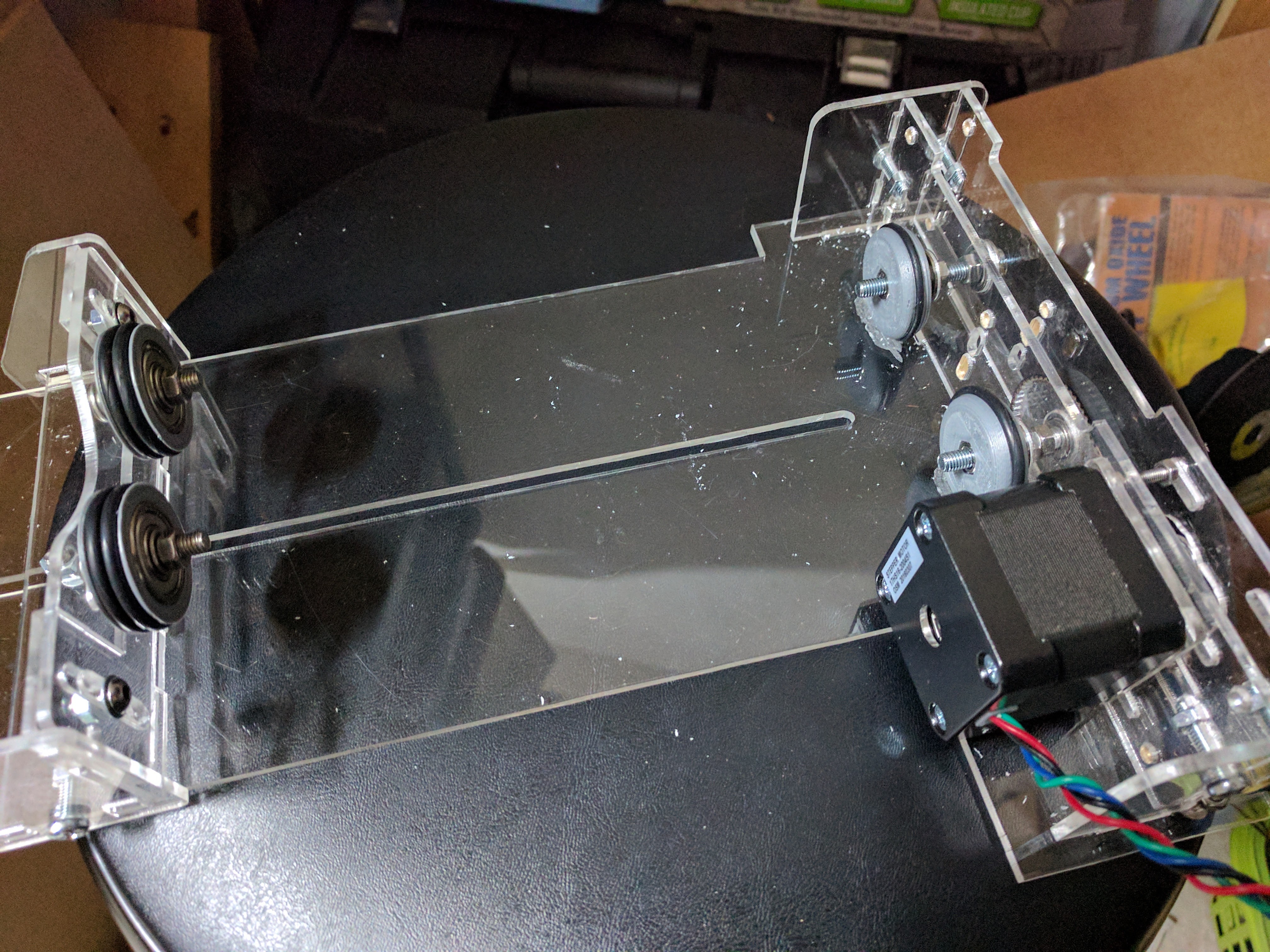 one side is adjustable to account for the odd bottles, etc. I would assume if you set it level on your bed then it should be fine. Coincidentally I also have made this, how’d your build go with only those photos to go off of? I took some liberties tweaking the drive train myself. I’ll post a pic in a few.