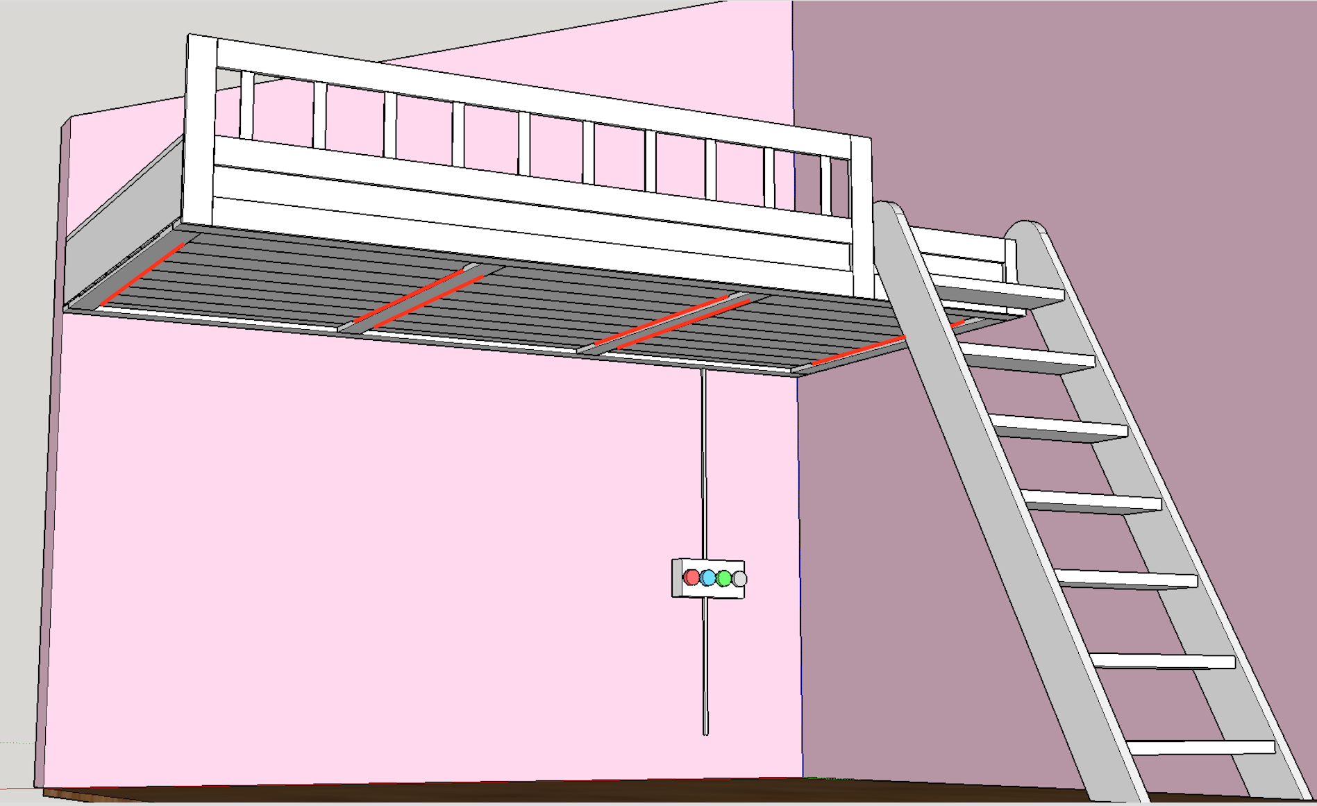 Hi all. I’ve been designing/building this loft for my 4-year-old daughter, and what started out as a plan to install white LED strips with a simple dimmer morphed into what I’ve told her is a “magic ceiling.” The LED strips are going to sit between the ceiling rails and the ceiling boards in some channels that I made with a router (shown by the red lines in the picture). I think the light reflecting off the ceiling boards and spilling across the surface should give a cool effect.
