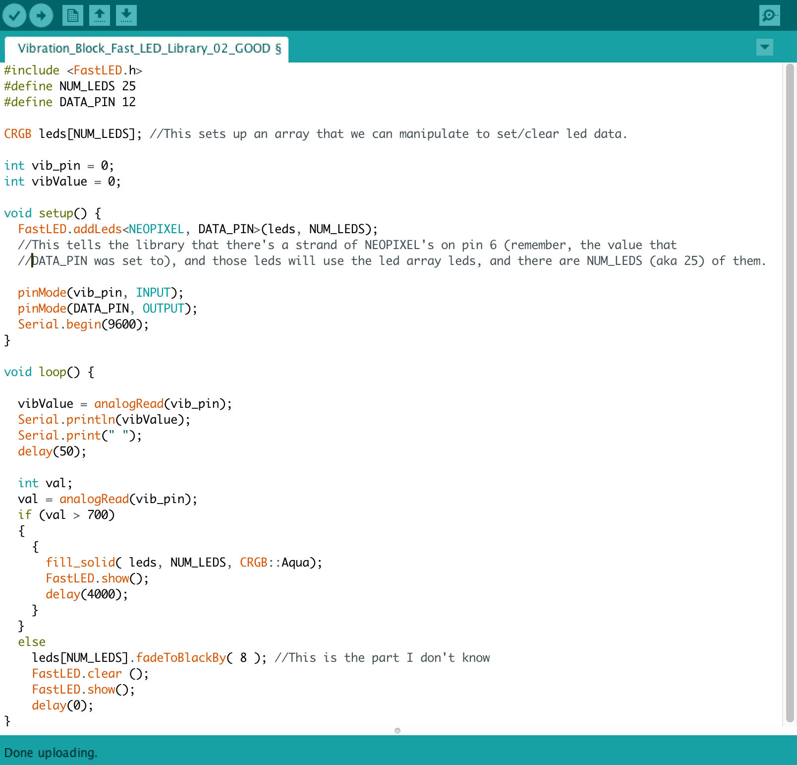 New to the group and still relatively new to code and microcontrollers. I’m looking for help on an interactive project I’m working on. I’m working on an LED project that is responsive to a fast vibration sensor with an Arduino Uno. Above a certain threshold, the LEDs (WS2812B LED Strip) all turn on at the same time for a set period of time. After that, the LEDs turn off.