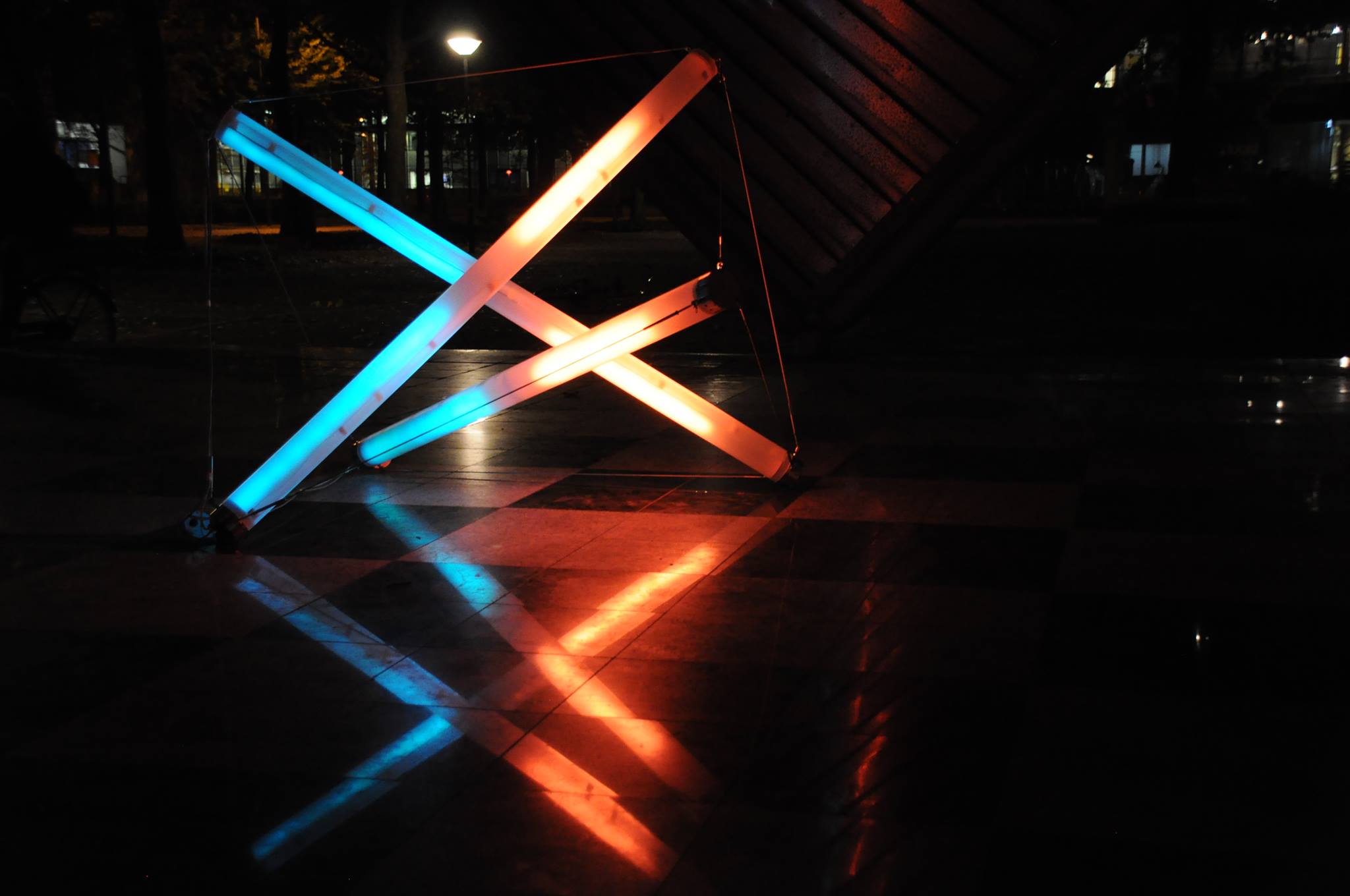So this picture shows our prototype: an interactive ‘tensegrity tripod’. The final installation will consist of 40 of these tripods, so a lot of work!