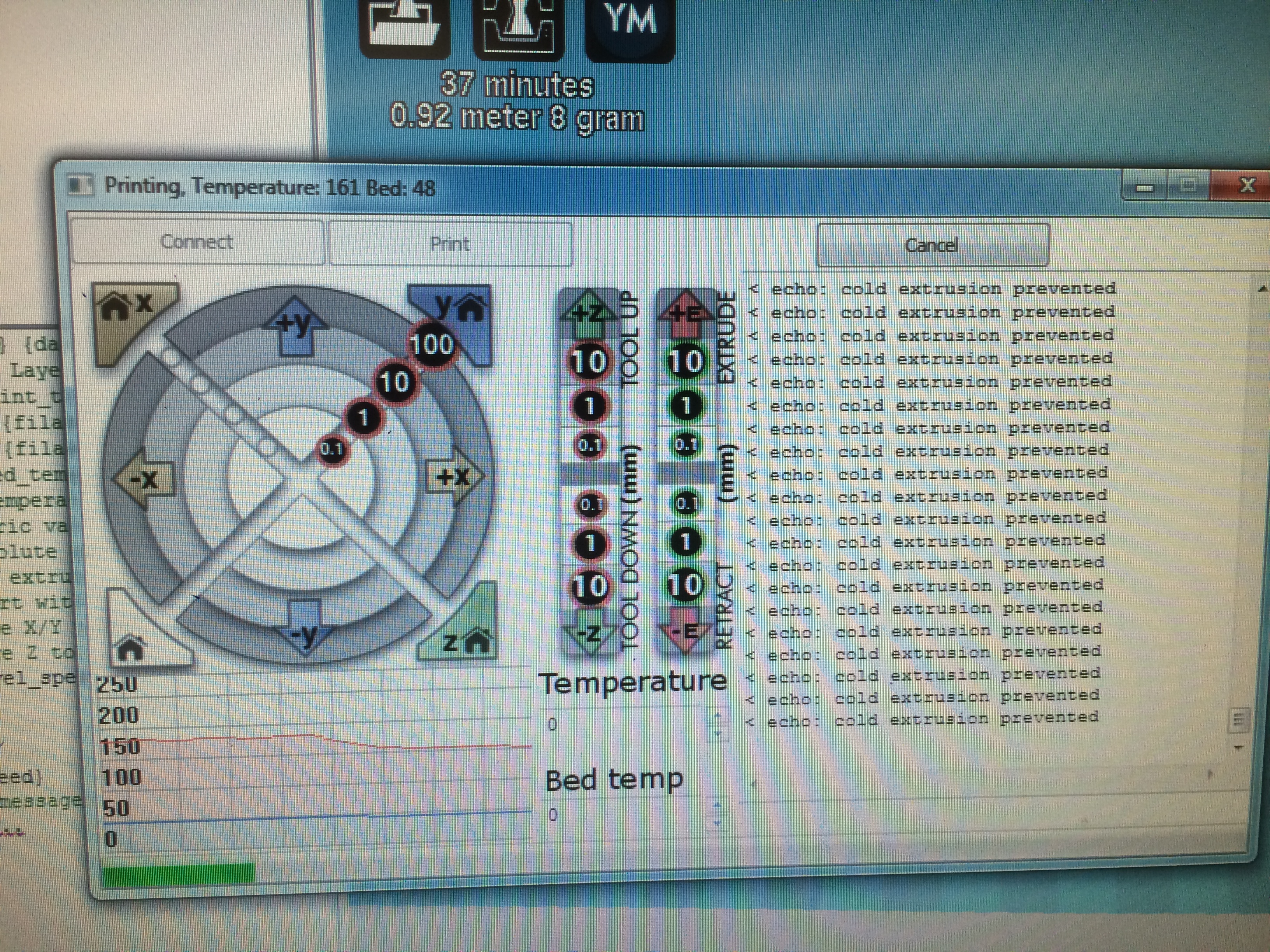 Hi guys i have a velleman k8200 and i use cura the latest version. I used to had problem with me heated bed and i changed the thermistor and now it is working. I also used to had problem with leveling but now im using glass bed and it is much better. So the problem now is that when the printer starts after 5 min the temp of extruder starting to fall.and i have a image like that.any ideas??