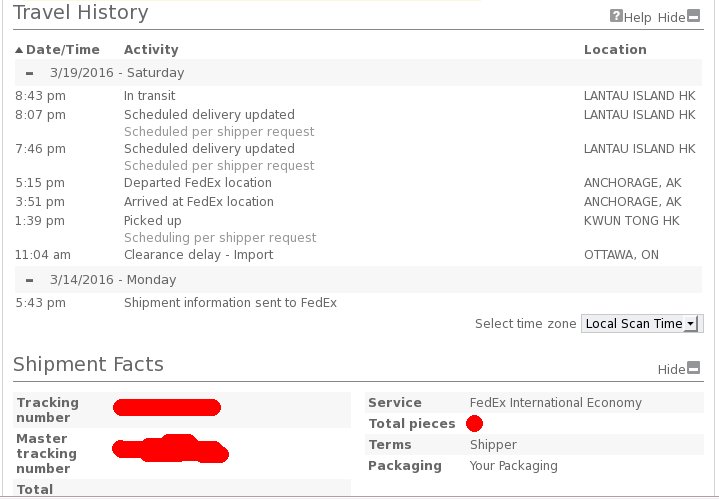 Hi guys i Ordered a 3D printer from China and been tracking the shipping to Ottawa, Ontario, Canada, but it looks like it flew to Alaska and back to HK. Can anyone make heads or tails out of this?