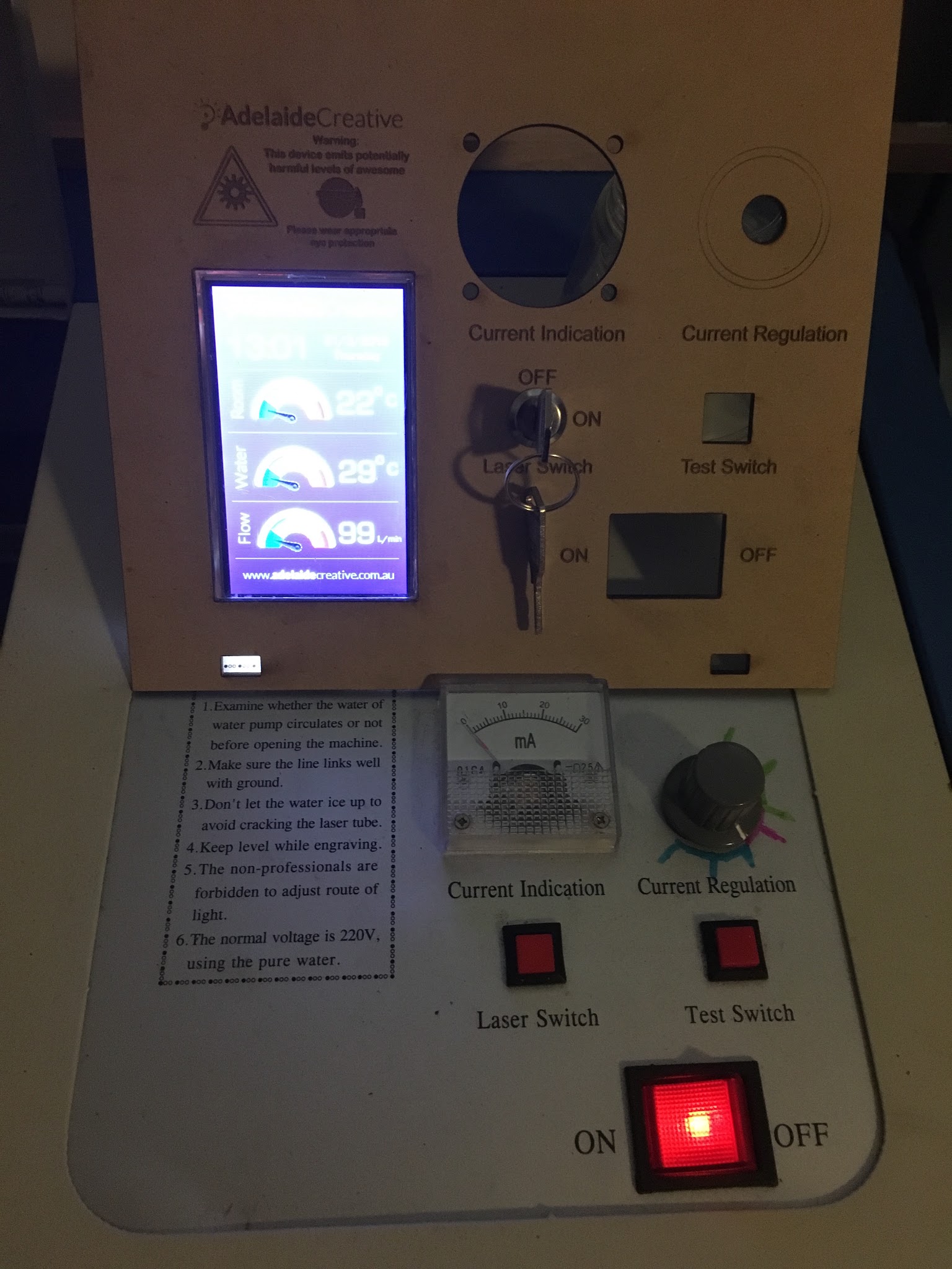 Maybe you can add more switches for air assist, exhaust and pump. like the idea of the key (fablab, makerspace?? or little brother?).