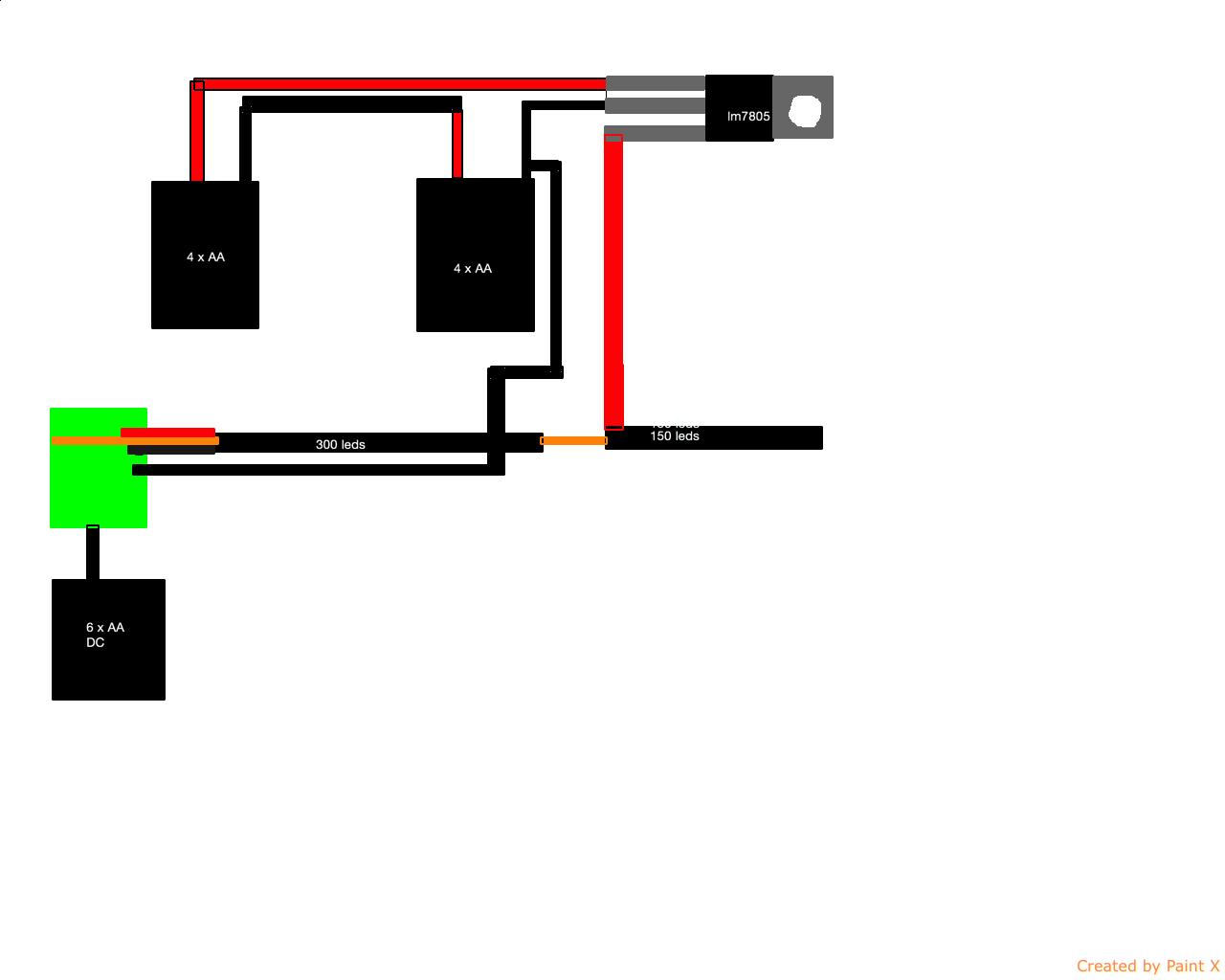 I did some research on regulation and I tried to draw a wiring diagram using an LM7805 but as I’m aware it looks like they are made for use on a breadboard which I am not currently using so I am not sure if wires wrapped around / soldered will work the same. It seems they need minimum 7v input and I have 2 4xAA battery holders i’d like to wire in series (if possible to save on costs since I have spare ones) and I could just use 6 batteries instead of 8 so there isn’t a lot wasted energy or more heat being dissipated.