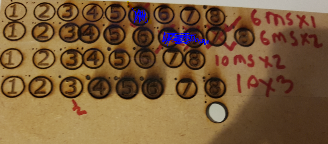 I have done some testing and if you look at the attached image shows that when I get to 7 or 8 (on my makeshift scale, Also attached.) Its most noticeable on the bottom 7 and 8, 10 ms and 3 passes of the laser). If I crank the dial too 13, I get almost no output., but both the dial and the brightness of the laser say otherwise…