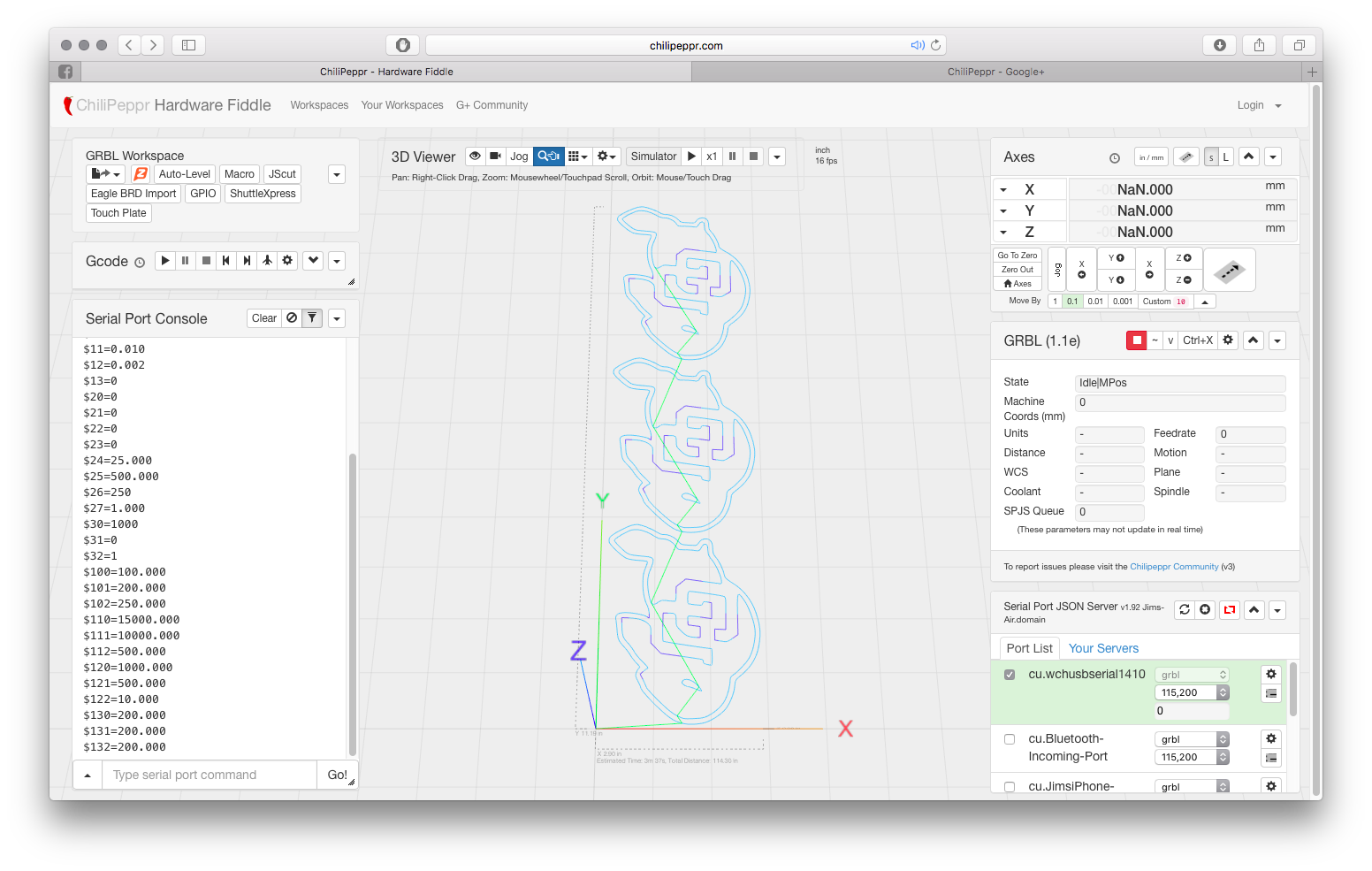 I recently updated to MacOS Sierra, which ruined everything, and has been nothing but trouble to get my laser cutter working again. Once I solved the issues that caused my mac to crash when any Arduino was plugged into it, updated to the newest version of GRBL and finally found the Sierra-compatible JSON server, it works once again! Now, however, in the ChiliPeppr GUI, I can no longer see the machine coordinates or any of the machine parameters. Anyone have any ideas how to solve this? NaN.000 is not very helpful for calibration!