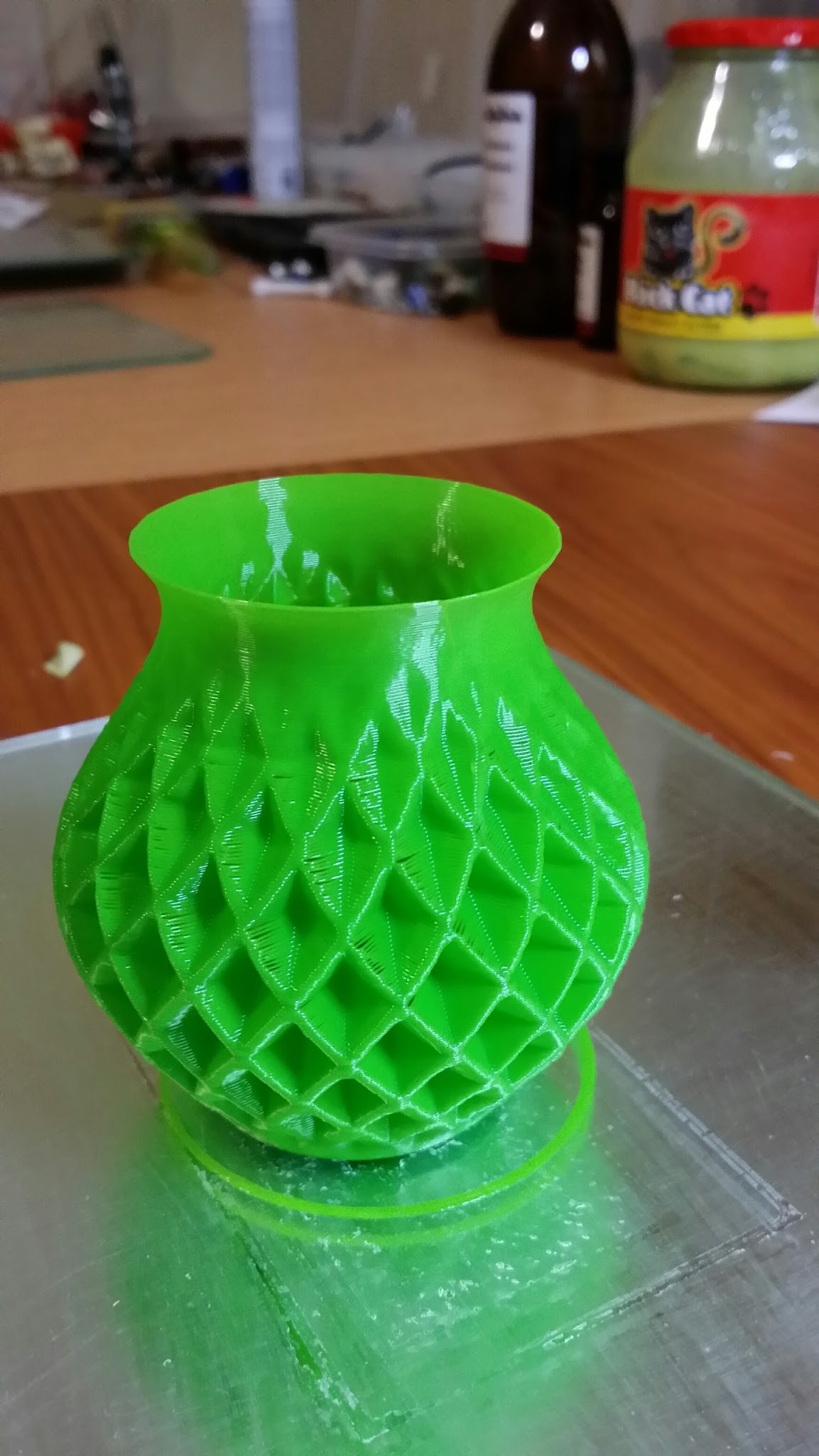 Temp = 210, PLA, Bed temp 60, Speed = 90mm, Slic3r vase settings . Mendel90