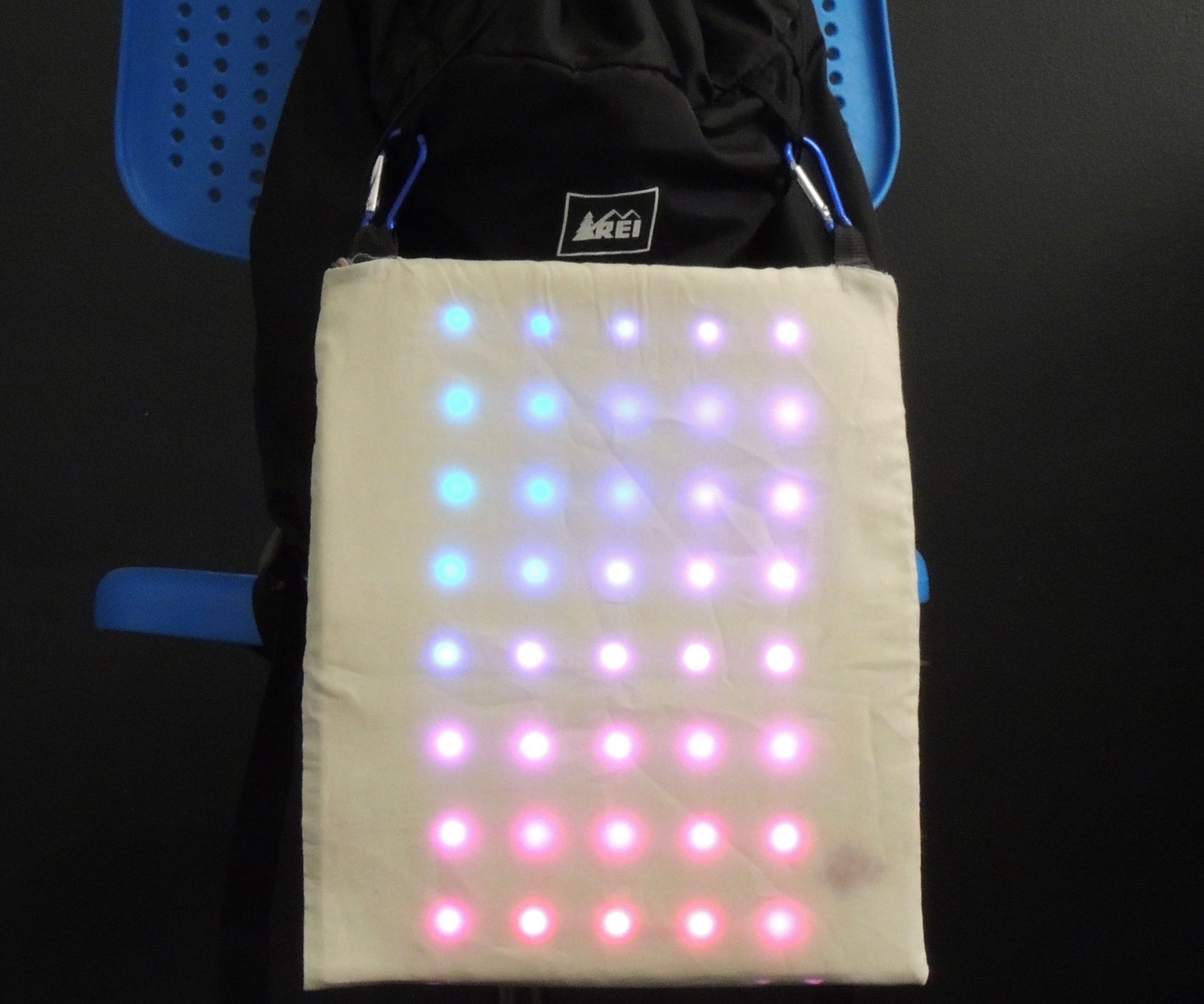 Hi there - I just finished an instructable for a small 5x8 matrix I built to hook onto my backpack for the burn. Aside from making my pack unique, it helped campmates find/follow me while we were out. I starting with NoisePlusPalette and added in a button and pot for mode selection and brightness adjustment. The lights are (heavily) diffused by a couple layers of fabric and craft foam.