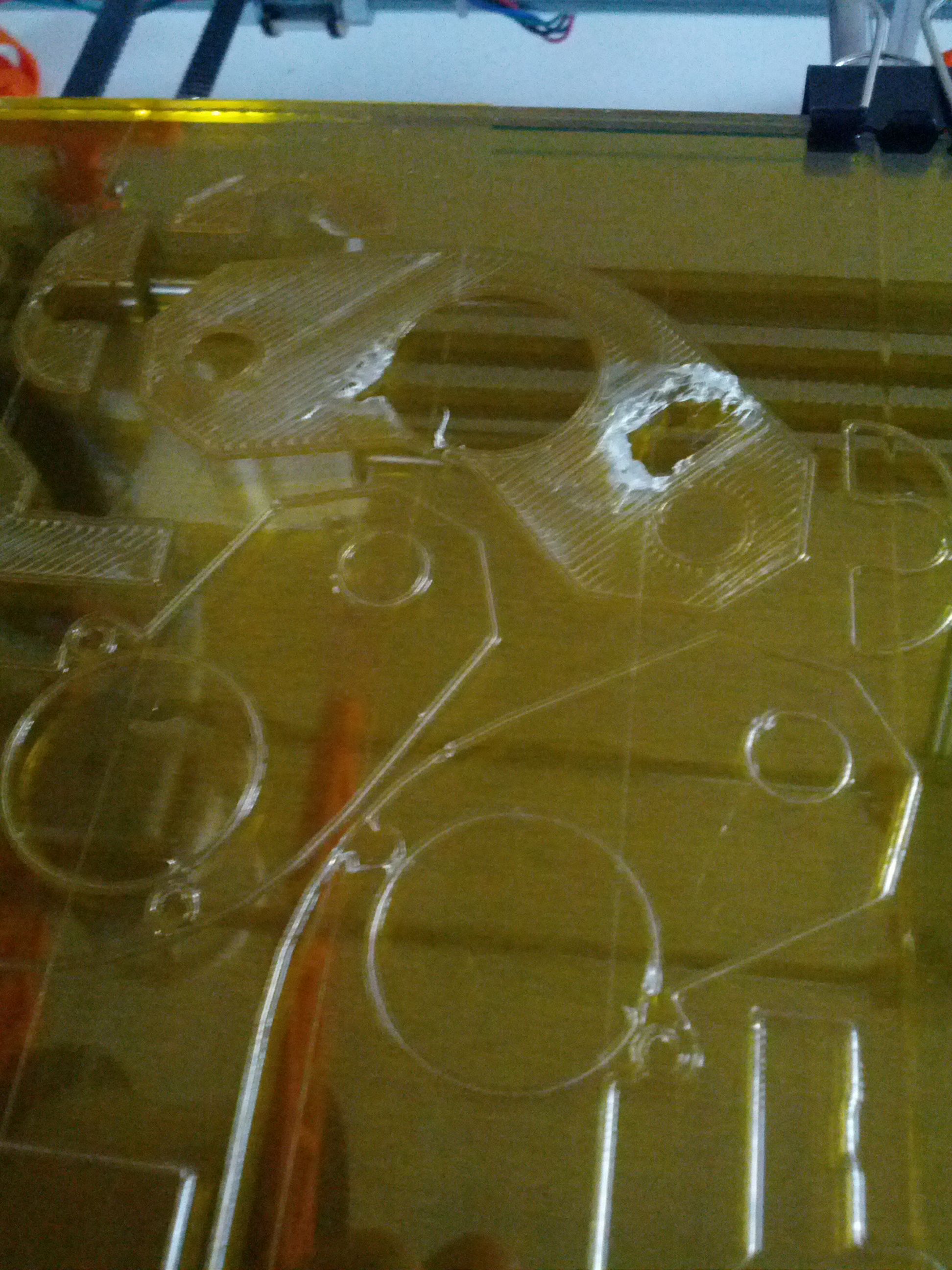 Hi, when I tried printing a larger plate of objects today the print started out ok but it tore a hole in the infill of the first layer of two of the parts I was printing.