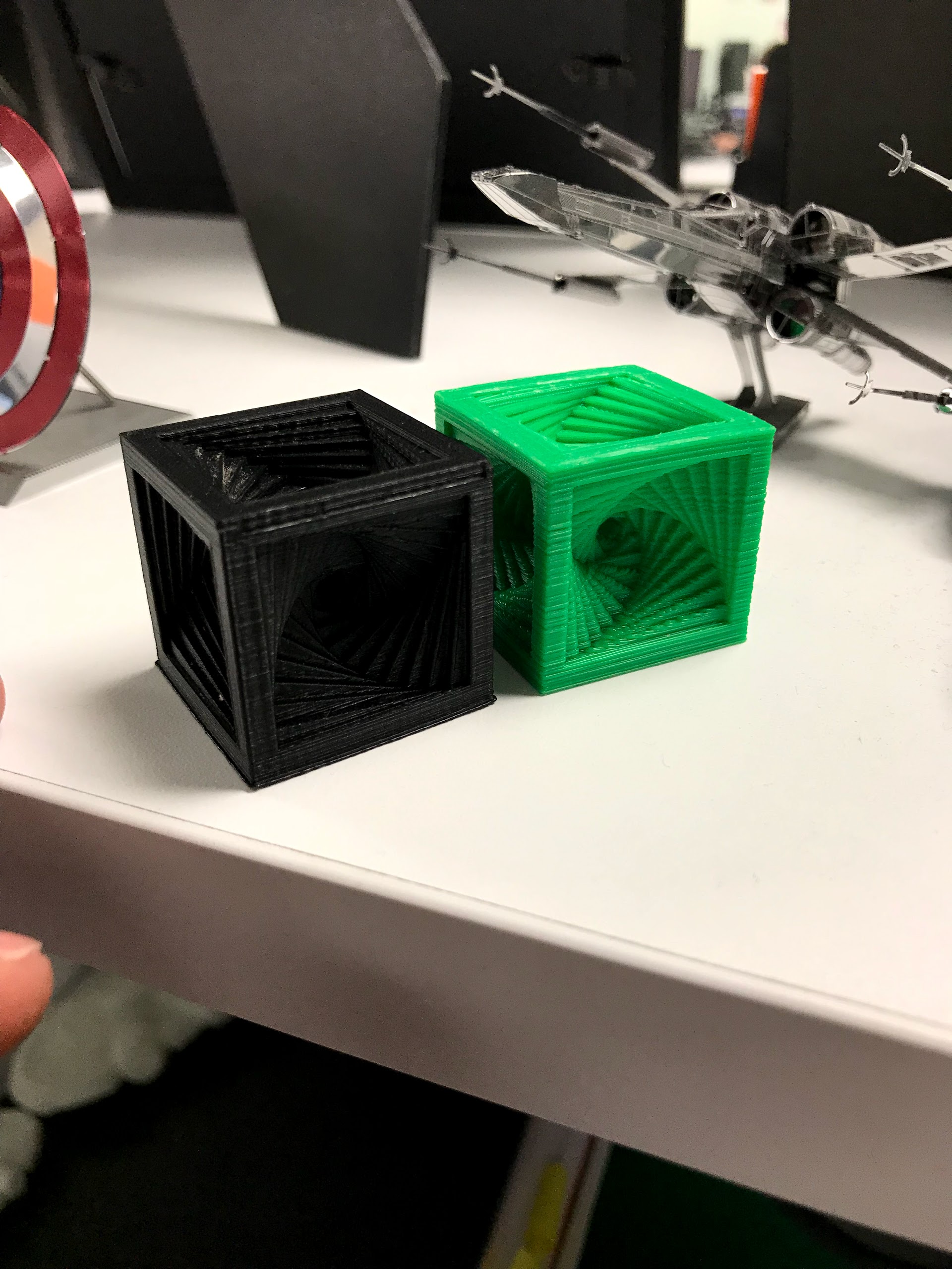 Hopefully you can see the quality difference between these 2 prints. The green is from my old Prusa i3 printer and the black is my new ReliaBuild3D RB2. The Prusa seemed to have a fair amount of Z wobble, as you can see on the green print. I probably could have gone a few degrees colder on the black one to get the overhangs better. Kinda fun though! I fidget with these at my desk.