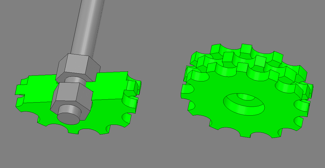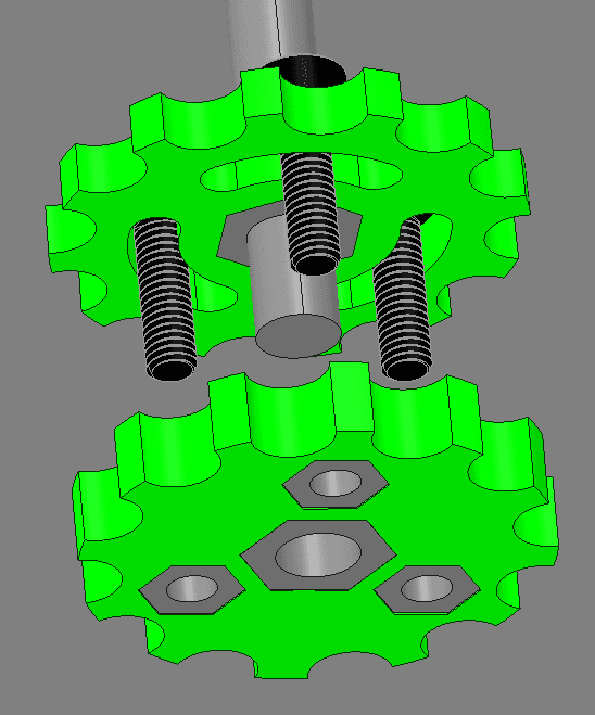 If you take the first rendering in the most recent image and change the circular recess to a hex, then slice it mid-way between the space between the nuts, it’s what I had pictured. The third gear between the two wasn’t in my alleged mind. On the other hand, for light duty, low force applications as you describe, I agree that this most recent image should work.