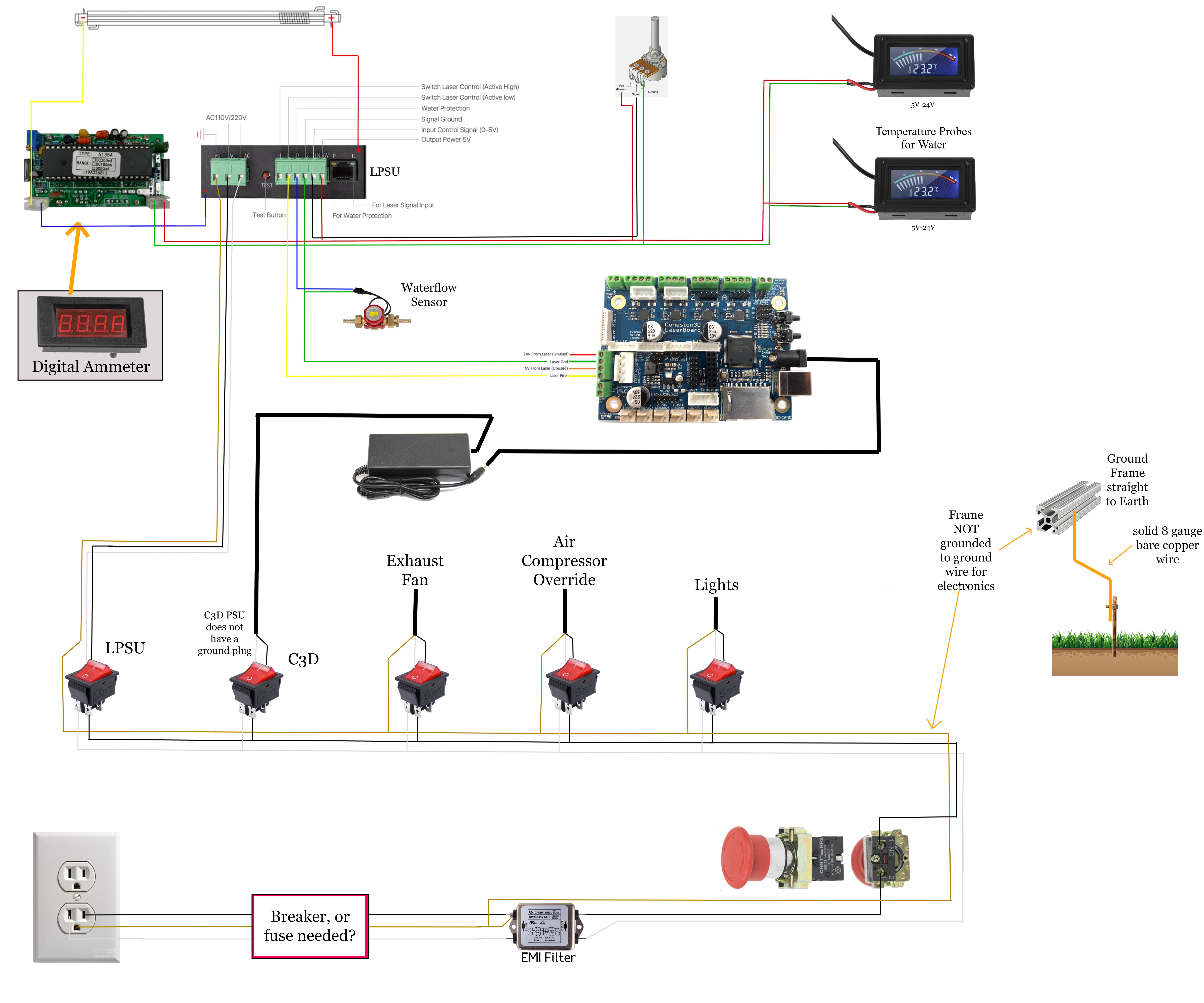 Sorry if I confused this one: The cathode of the tube is wired to the current meter who’s other side should be wired to the ground on the LPS. Ground that point and the laser power supply to the frame, keep wires including grounds as short as possible.