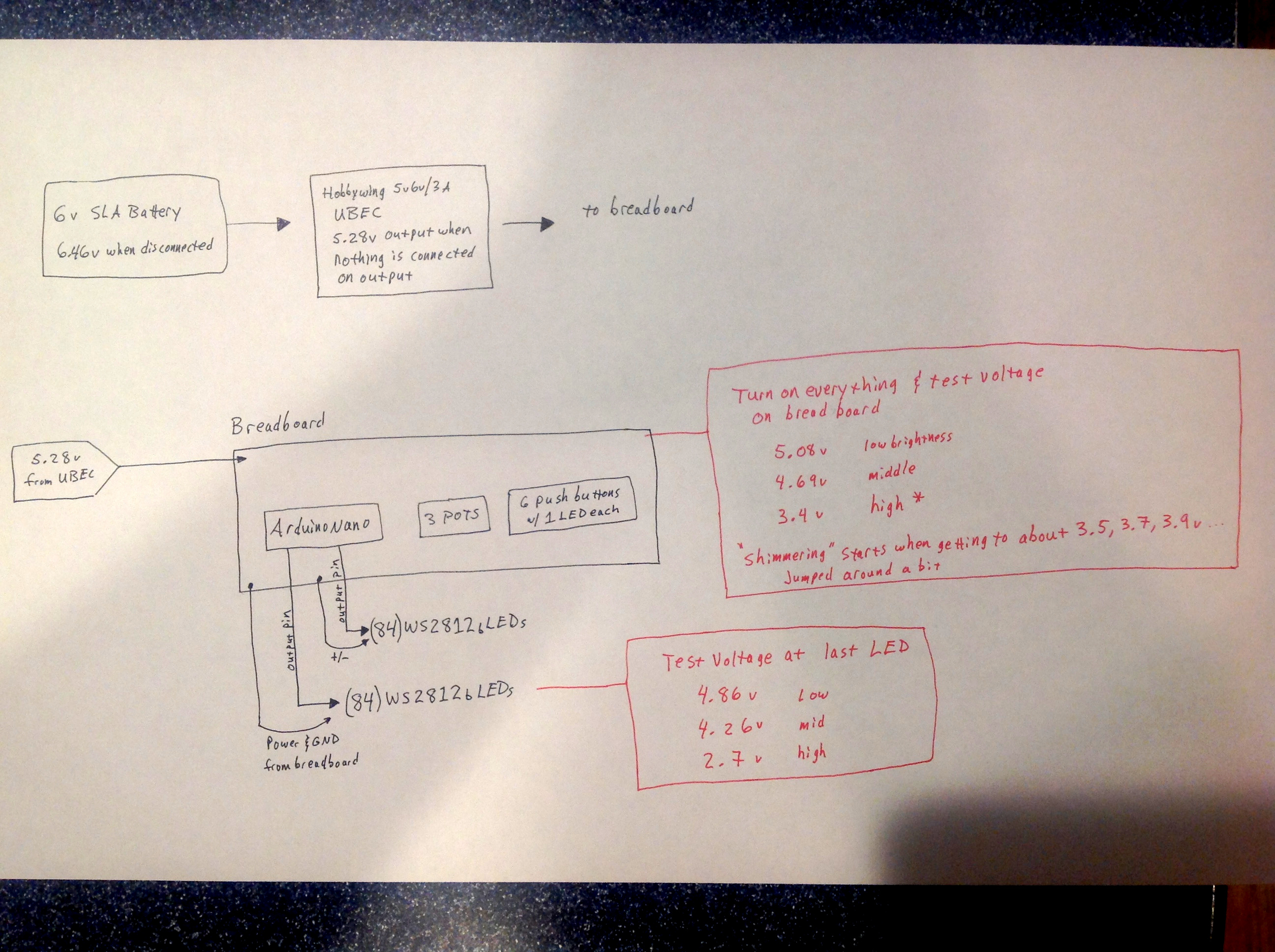 Thank you all for the help! I’ve attached a link to the PDF schematic of my test setup. Learned a lot and still need to learn more moving forward! Adding in the 2nd UBEC did eliminate the “shimmering” I was seeing. I’ll have to show some pics when the project is finished. I move slow, so may be a while yet! But it is a two player 00-99 scoreboard. The pots change the color for each score, and one to adjust brightness. The buttons change/reset the score. https://drive.google.com/open?id=1Gdv50Nth8wlE9gxhs1kkmWtIG2qhwhUZ