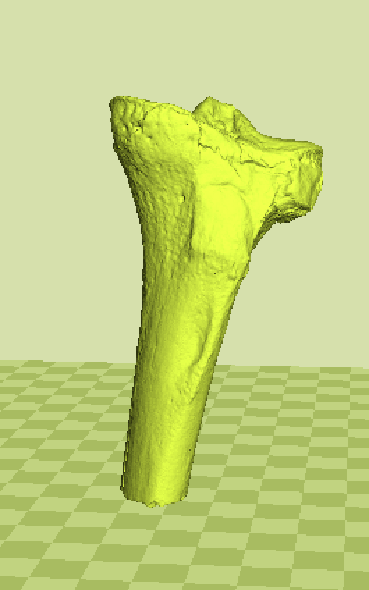 I printed a downsized set of more recent human leg bones a couple years ago Meshlab will reduce the stl file size if you need it, then netfabb (either download or online) can reorient it to horizontal. You’ll still need support but try rotating the bone sections to minimize the amount of support removal you’ll need to do.