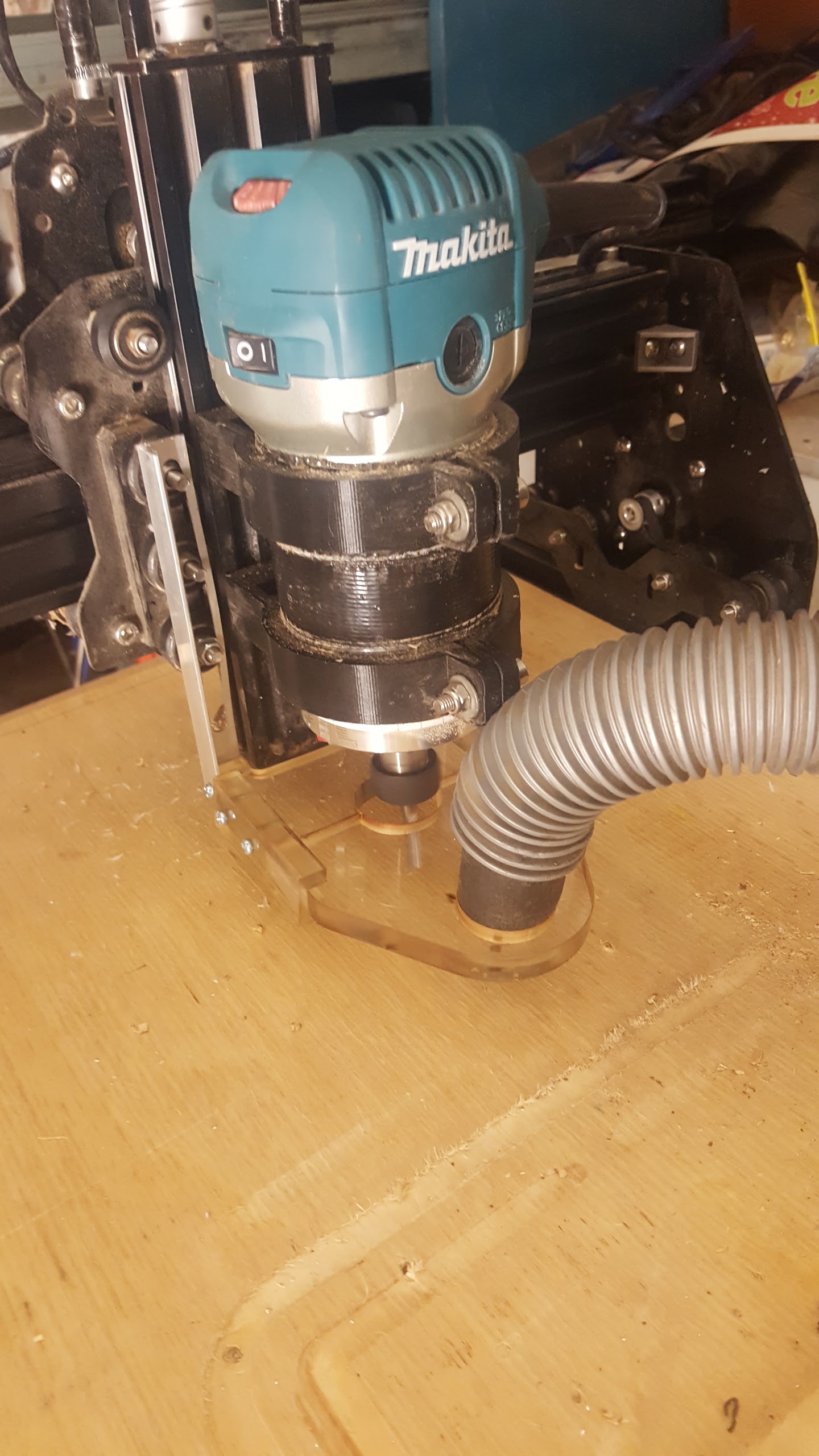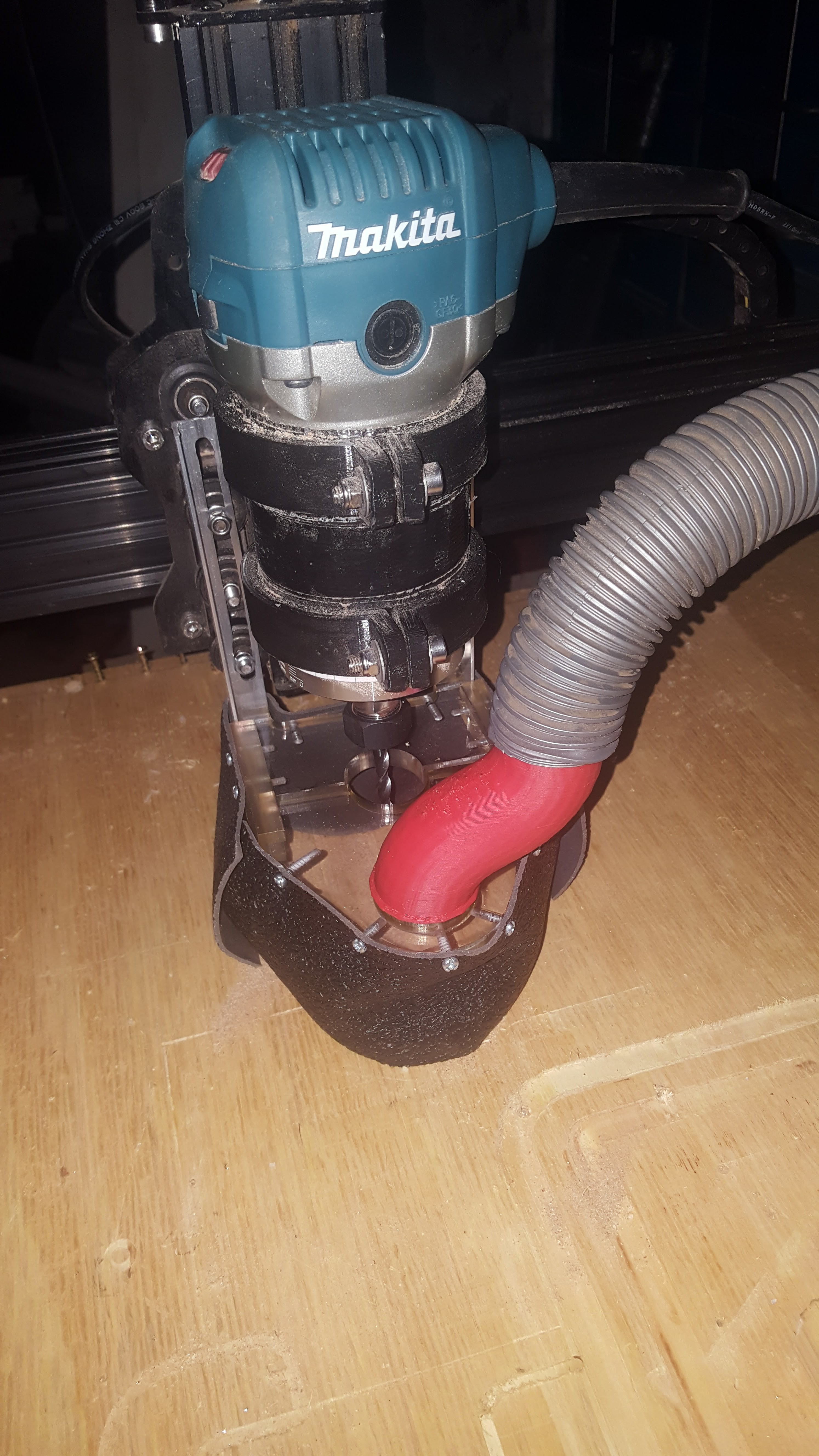 I am still to add a curtain, and will probably print a new nozzle to connect the hose to the boot, but you get the general idea of my OX dust boot. I would like to add an LED light, and will probably put a cyclonic dust separator in between the shop vac and the boot at some point (the shop vac seems to be doing very well so far). This works nicely and even without the curtain is pulling in most of the dust (even on mdf).