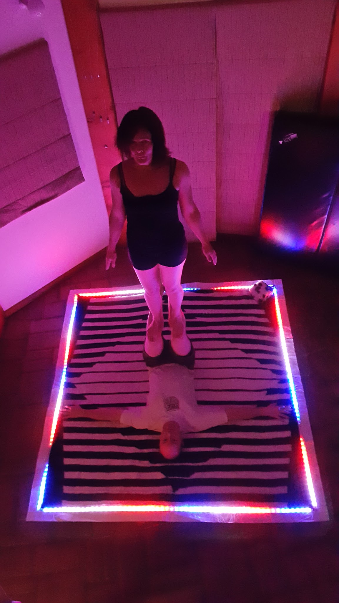 I collaborated with a friend to make the ultimate festival blanket. Fluffy and waterproof, made from a recycled advertising hording and a lot of fake fur, with 240 LEDs around the edge running FastLED, of course.