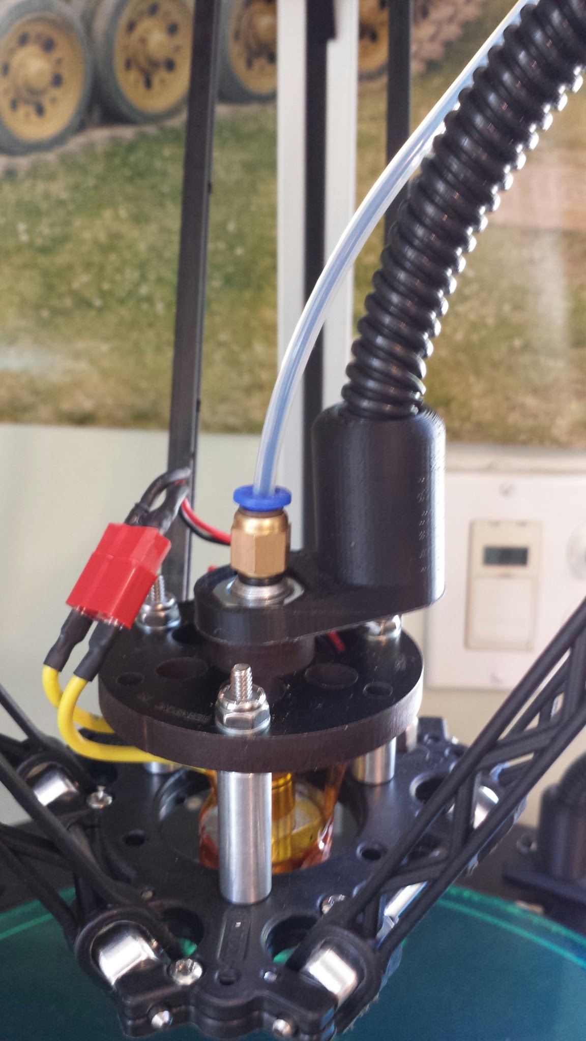 I designed and made a bottom and top mount for some flex split cable tubing to run the wires between the hotend and the base of my Rostock Max.