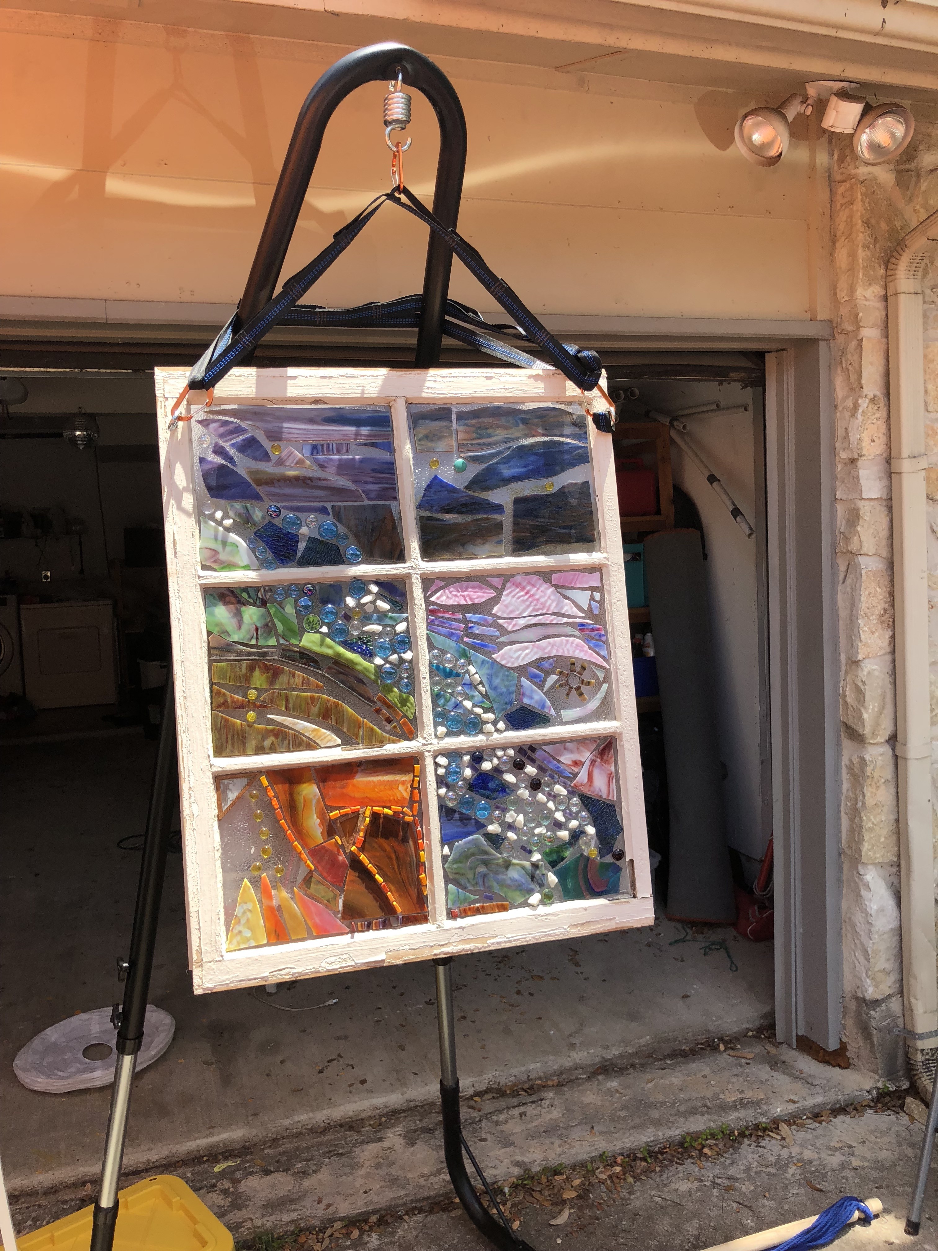 I did a stained glass mosaic on an old window and hung it from a hammock chair stand. This was done for Flipside, the largest Texas burn. I had a removable back panel that I took off during the day for light to shine through. The glass was ungrouted, but I covered the back in diffusers for an office fluorescent light. The LEDs were in a 5 x 20 matrix of P9813 square pixels. It was a last minute projects, so it still needs some work. I’d like the pixels to be further away to help with diffusion. I also need to work on which patterns to use and the brightness settings. This ran all night though on a USB battery and was a good hippie catcher.
