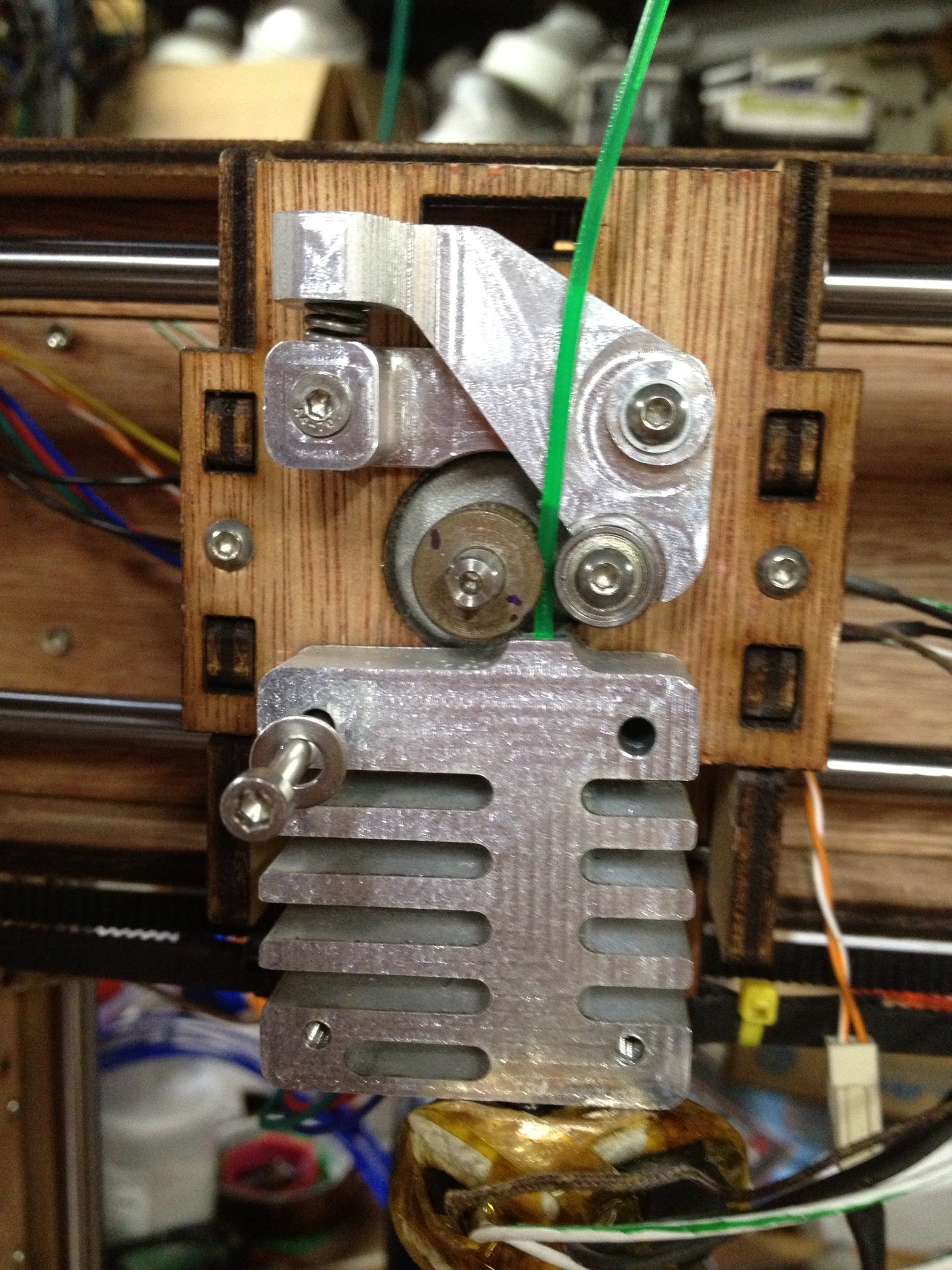 I finally got the extruder sorted out on my “ultimate thing-o-matic upgrade”. Because the extruder hot end has to be much longer than it was on the thing-o-matic, I had to figure out a way to extend it. After much experimentation I finally came to this setup. The makerbot aluminum block was replaced with a cnc machined aluminum heat sink with a 2mm hole drilled through it and 6mm threads on the bottom. I machined a new heat barrier tube from stainless that is pretty much like the makerbot one but a little shorter and thinner to reduce heat transfer.