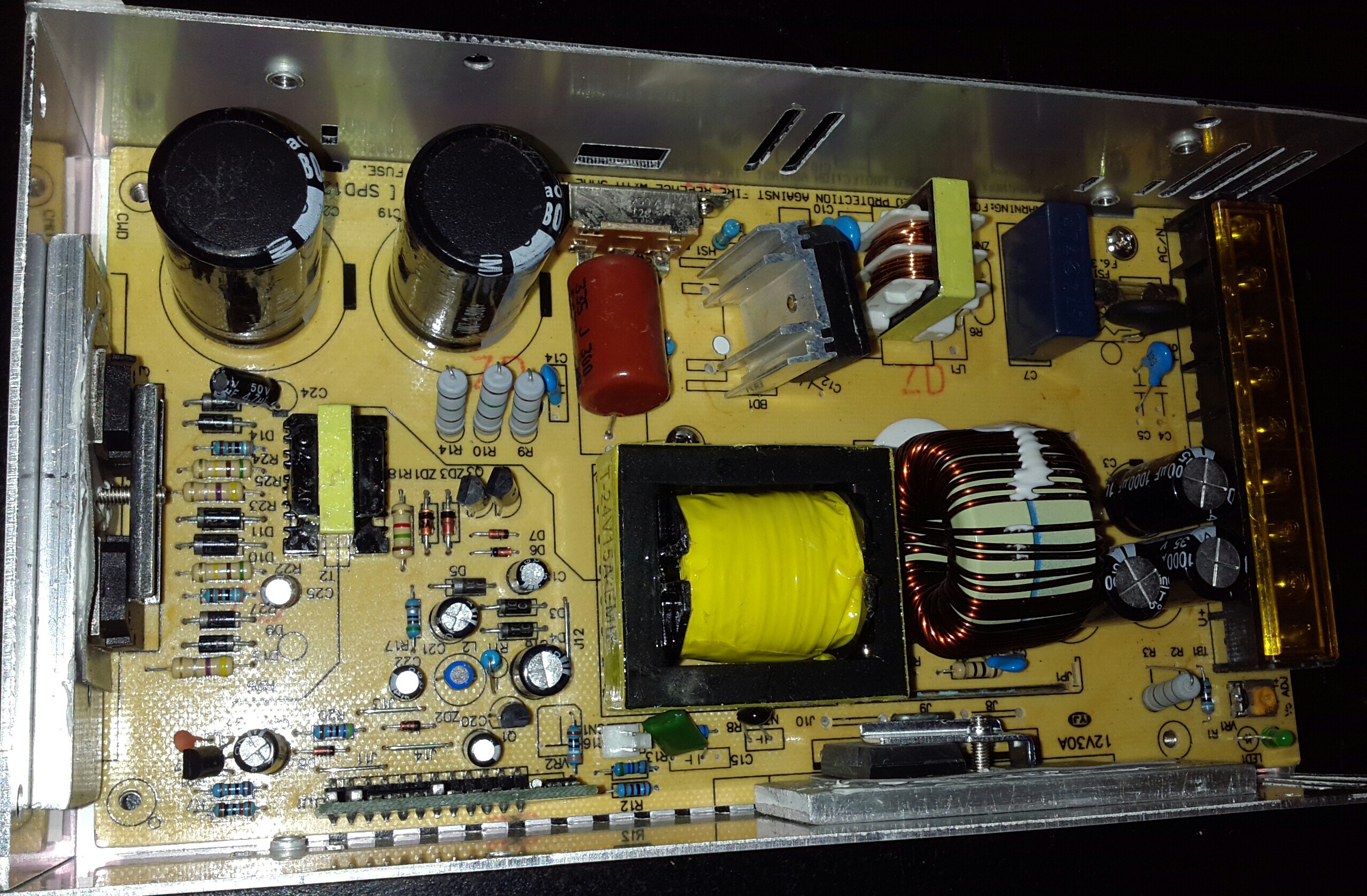 The PCB has 5 screw holes; only 2 are used. Four of the heatsinked semiconductors seem to be substituting for the missing screws, but of course this places additional mechanical stress on the devices.