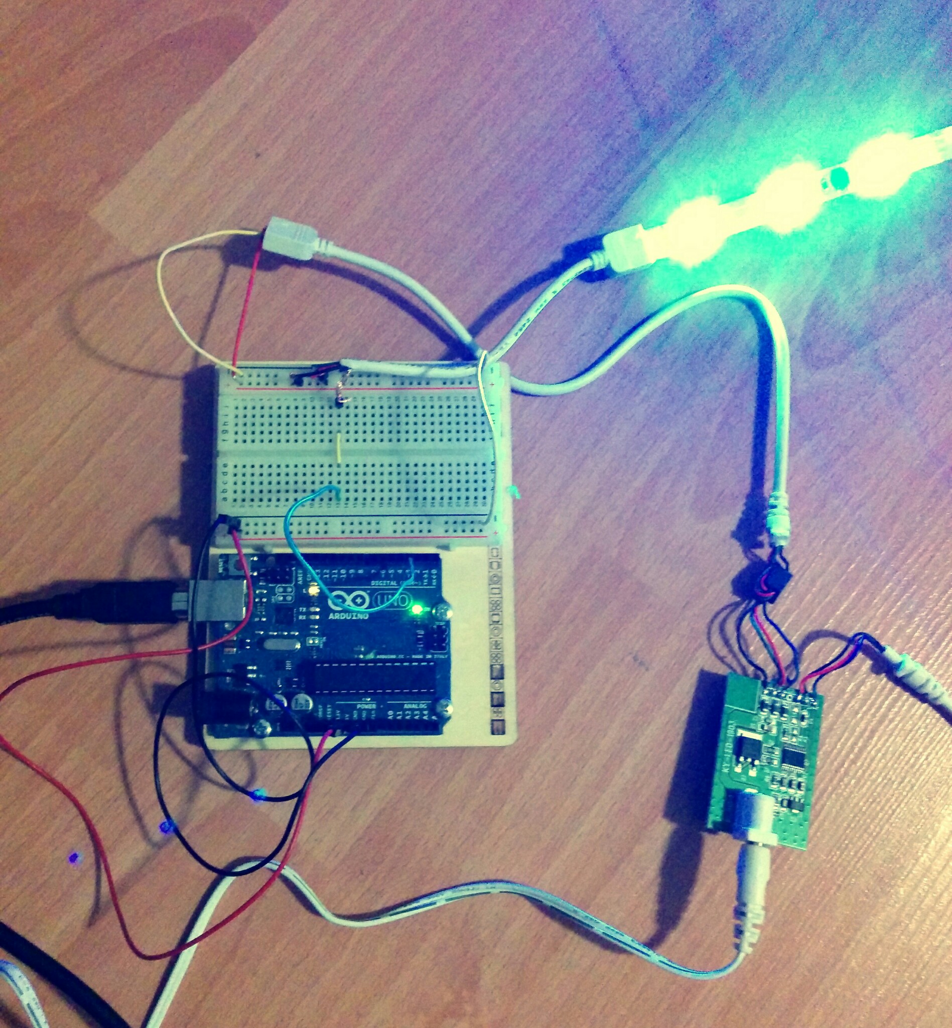String is WS2811 compatible. 3 LEDs per pixel, so 24 pixels per 8’ string. Wiring is dead easy. Tie ground to Arduino’s ground, data (DI) to Arduino’s data pin, and then attach provided 12V power source’s + line to VCC. I used the wire provided in the kit; red & green are ground, black is +12V, and blue is data.