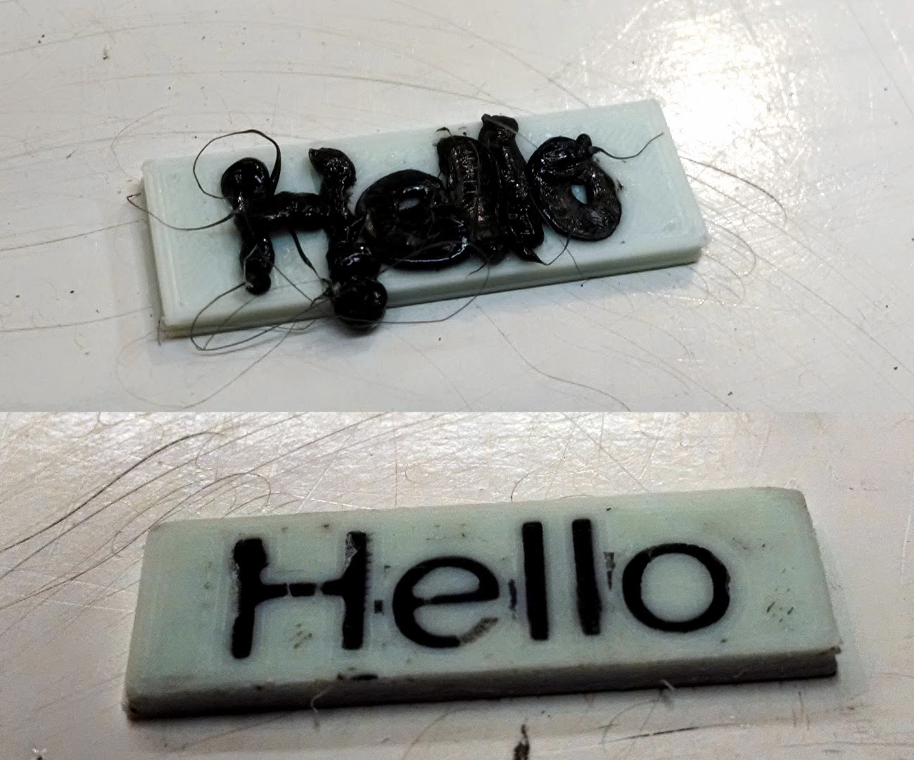 Tonight as a first test I printed a small piece out of white ABS which is 10mm high and 2mm thick and has the word “hello” as text that’s 0.5mm recessed. When that was done I used the pen to glob black ABS into the lettering - the idea was to fill the groove, not to be pretty. Then I took the result and sanded it down level. Not perfect, but I’m satisfied with it as a first try! I might make the lettering a little deeper and I’ll certainly make the next test bigger so it’s easy to hold on to when sanding.