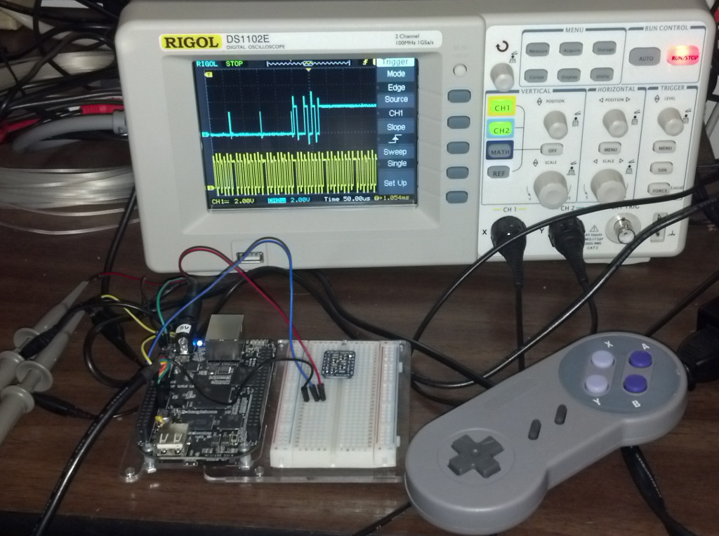 Looking at my scope’s output, I can see that the signal looks good (even at the full 48MHz clock speed). I’ve found that if you slam the MCSPI_CH0STAT by polling it over and over, you will receive a bus error. But, if you poll only 500 or 1000 times before timing out, it works out better. Also, you can probably busy-wait a bit more between checks. You’ll want to usleep() immediately prior to sending your message(s) to ensure that you’re sending your SPI data from userspace at the start of your current timeslice. You could use sched_setscheduler() to boost the priority of your SPI comm thread to real-time priority, but I didn’t see the benefit in this. If you need real-time guarantees, you can always use the PRU to talk to the SPI registers.