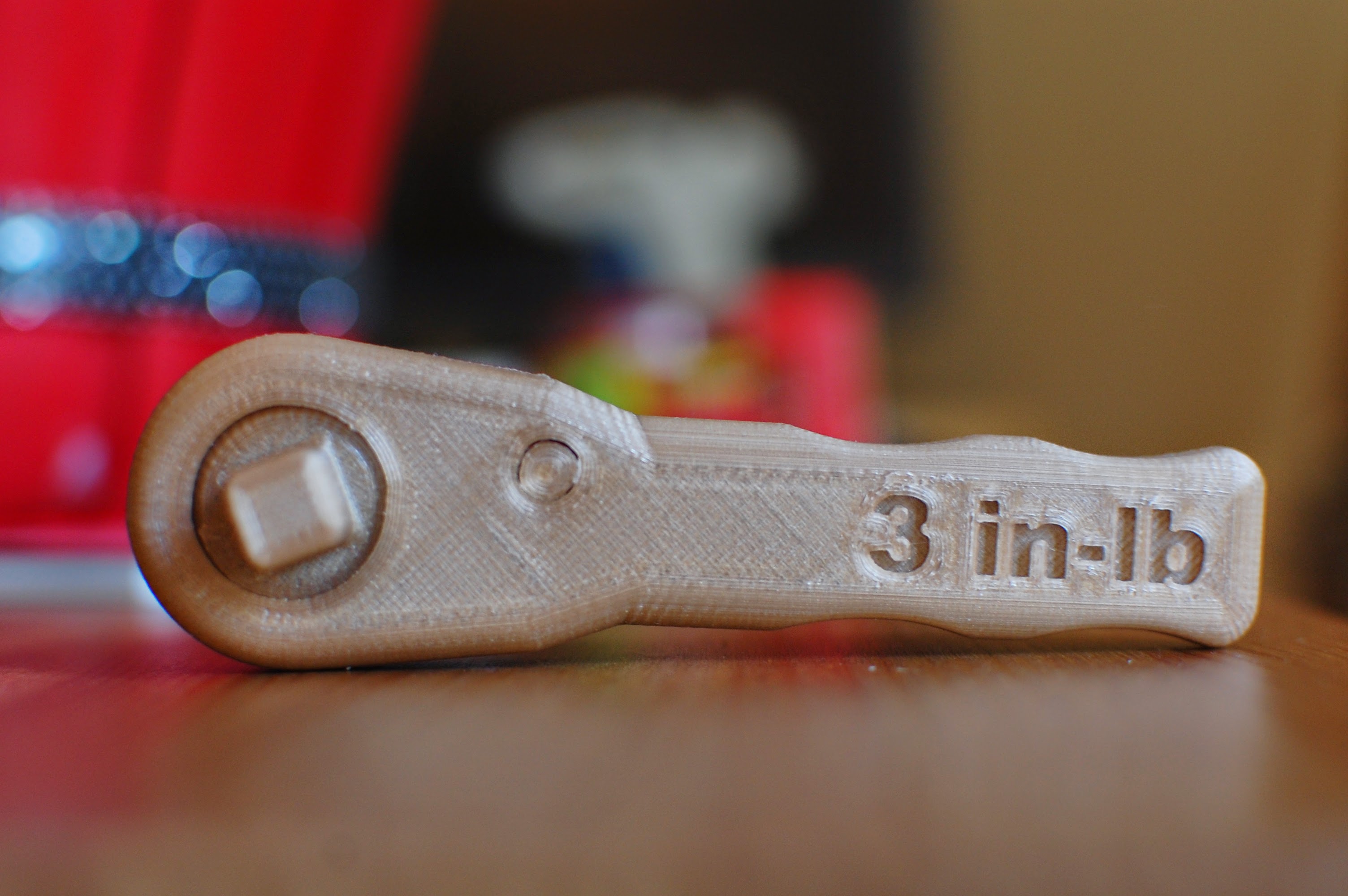 I have completed two prints of “the wrench” in PLA. Both parts function properly. All I did was use a small adjustable wrench to hold the socket adapter and turn the printed wrench in the loosen direction to break the ratchet free. There wasn’t much resistance and the same gcode was used for both colors.
